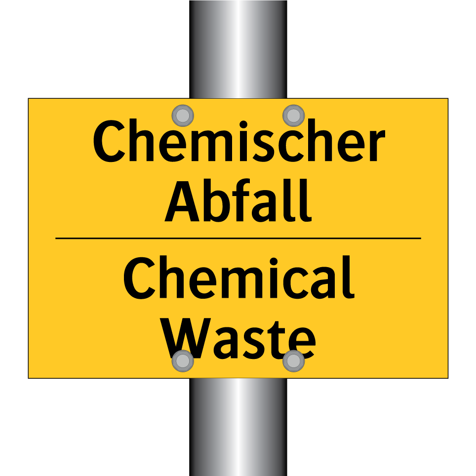 Zweisprachiges Warnschild mit deutschem Text Chemischer Abfall und englischem Text Chemical Waste