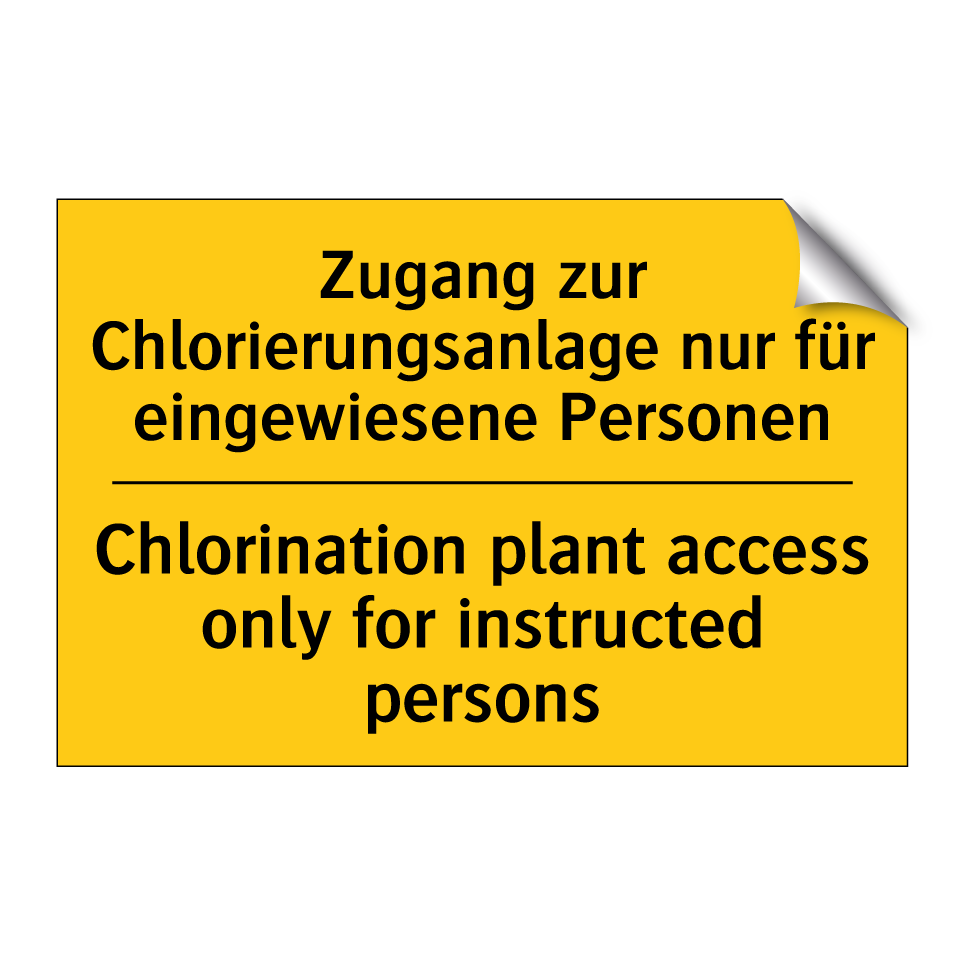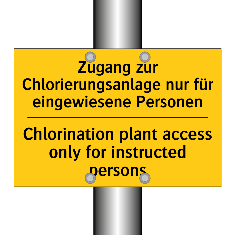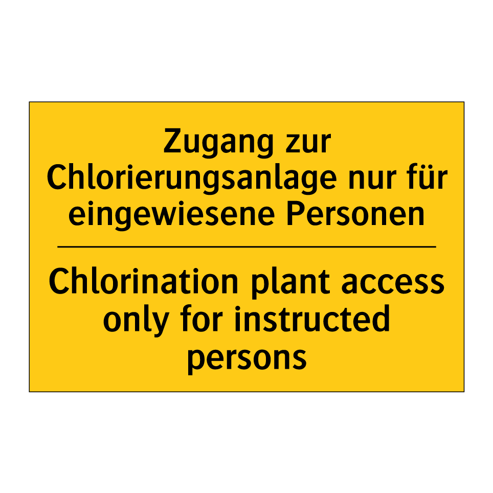 Zweisprachiges Warnschild mit deutschem Text Zugang zur Chlorierungsanlage nur für eingewiesene Personen und englischem Text Chlorination plant access only for instructed persons