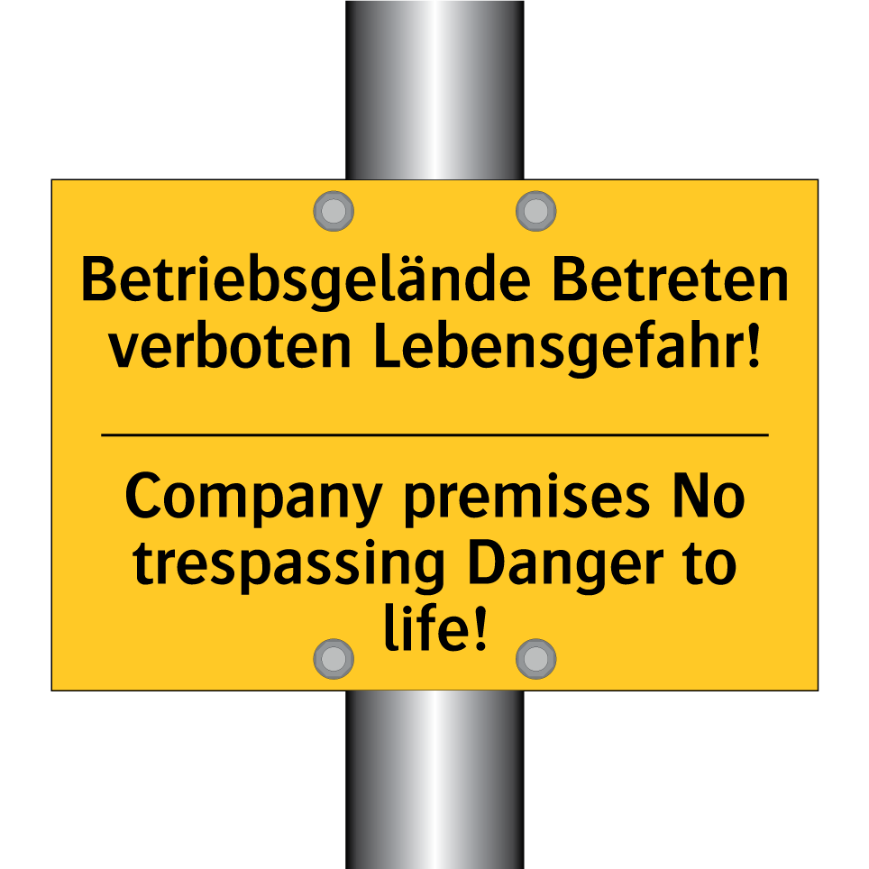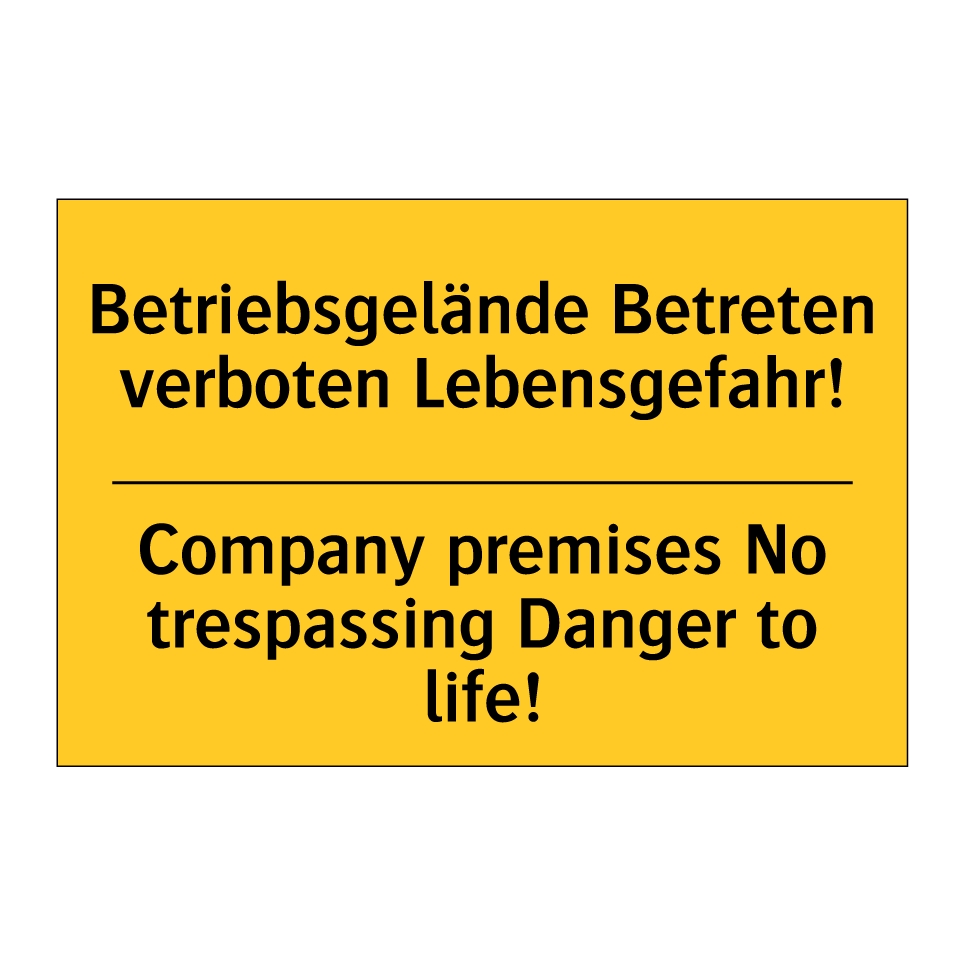 Zweisprachiges Warnschild mit deutschem Text Betriebsgelände Betreten verboten Lebensgefahr! und englischem Text Company premises No trespassing Danger to life!