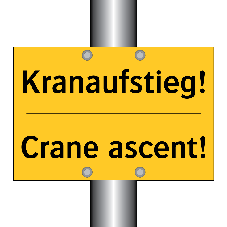 Zweisprachiges Warnschild mit deutschem Text Kranaufstieg! und englischem Text Crane ascent!