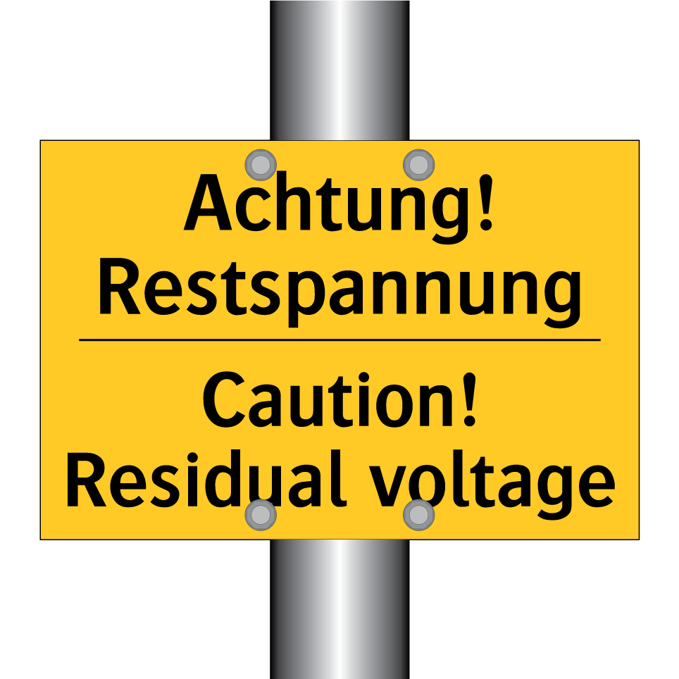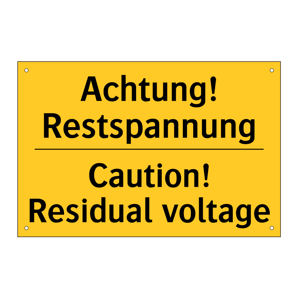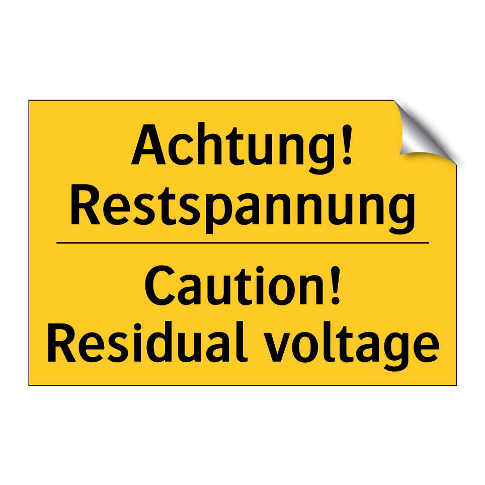 Zweisprachiges Warnschild mit deutschem Text Achtung! Restspannung und englischem Text Caution! Residual voltage
