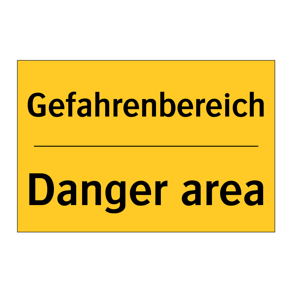 Zweisprachiges Warnschild mit deutschem Text Gefahrenbereich und englischem Text Danger area