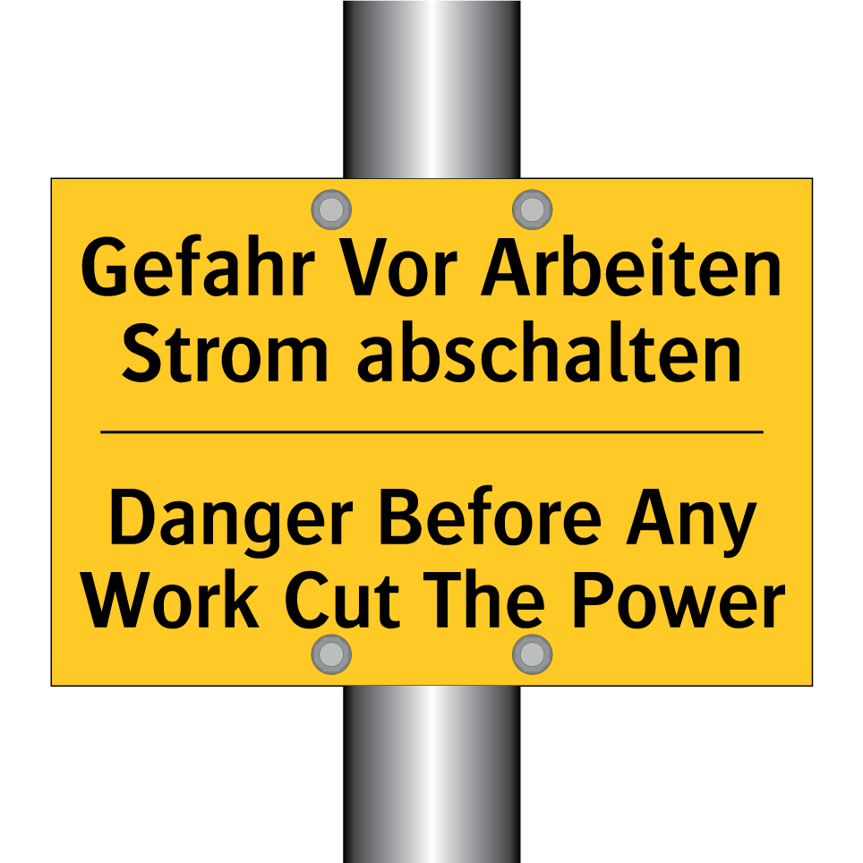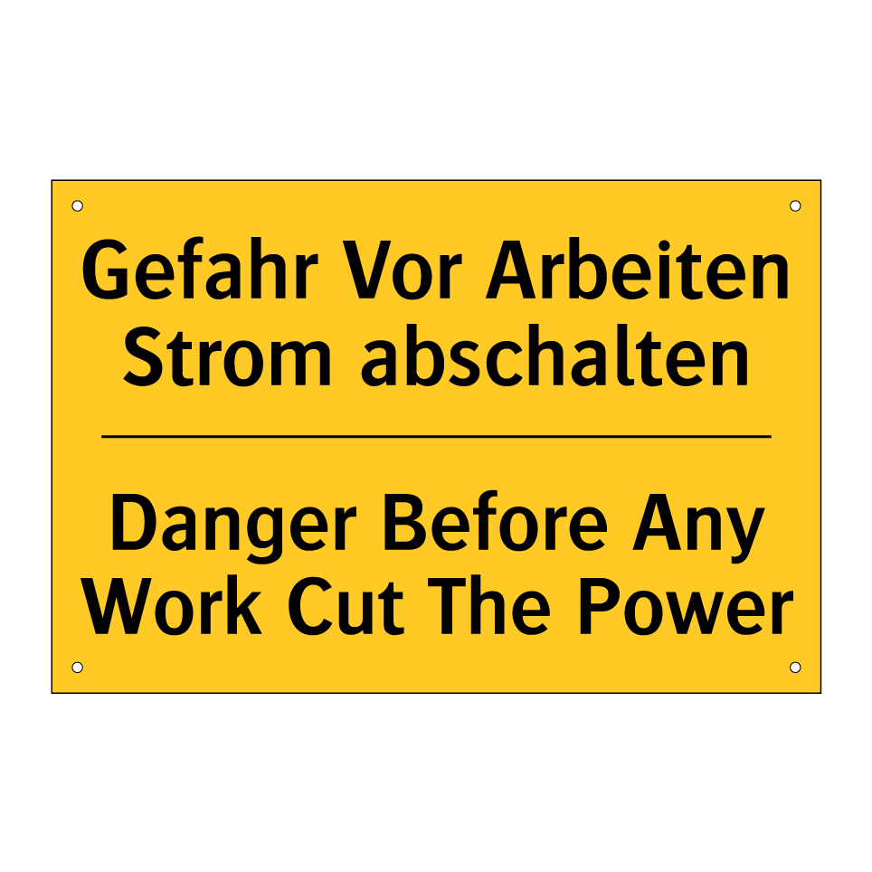 Zweisprachiges Warnschild mit deutschem Text Gefahr Vor Arbeiten Strom abschalten und englischem Text Danger Before Any Work Cut The Power