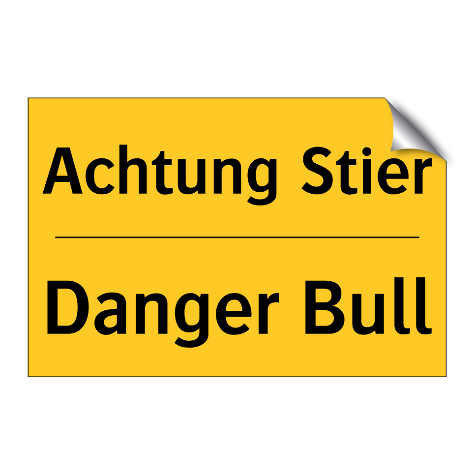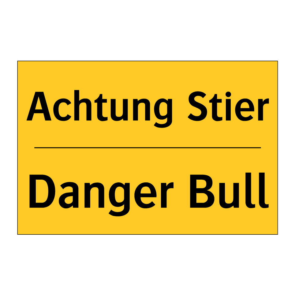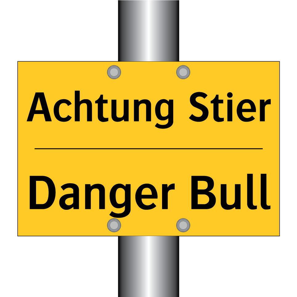 Zweisprachiges Warnschild mit deutschem Text Achtung Stier und englischem Text Danger Bull