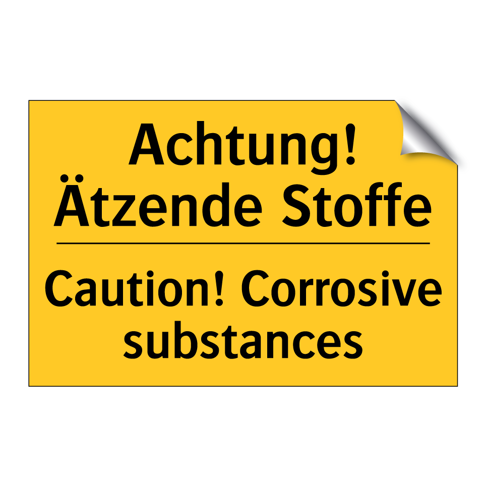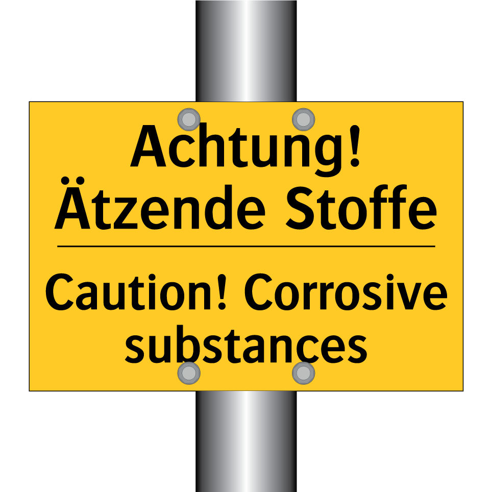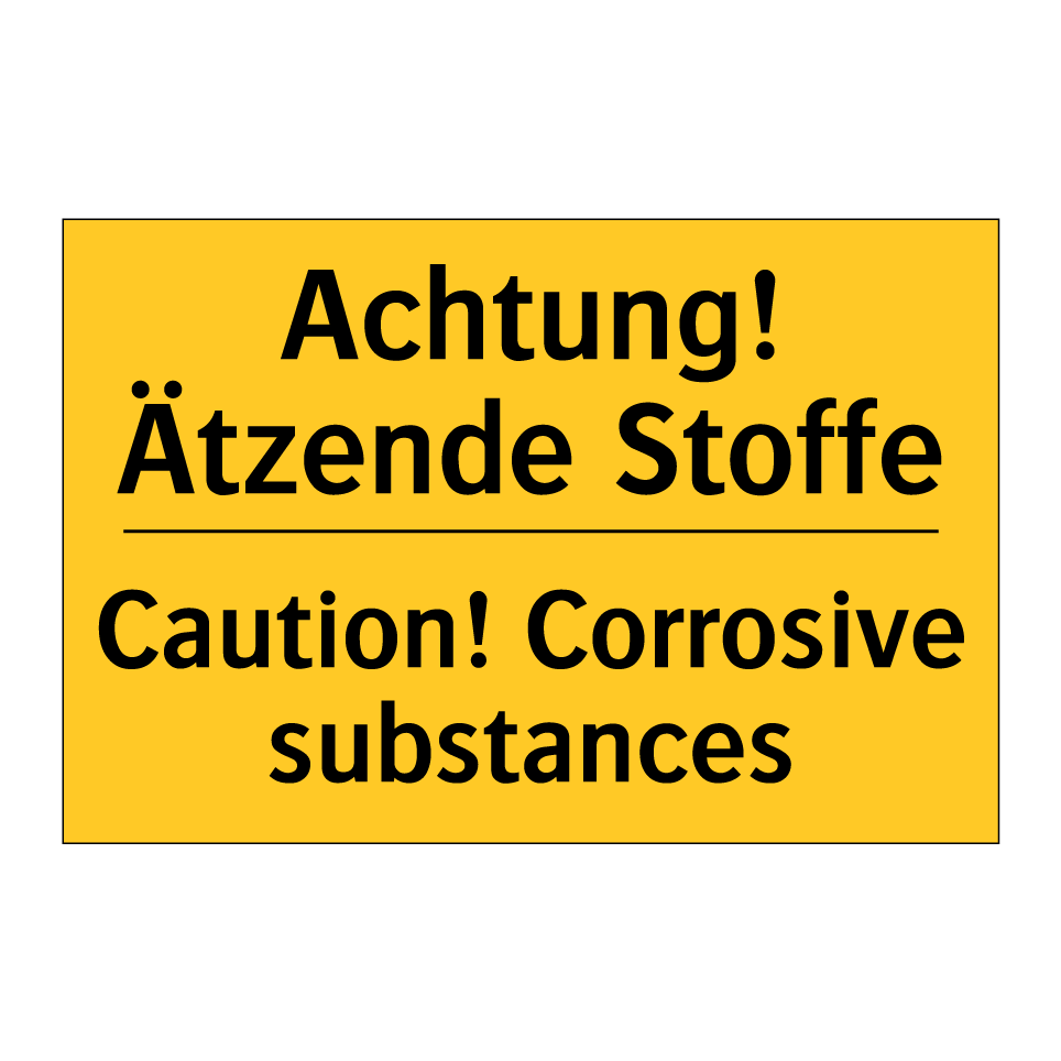 Zweisprachiges Warnschild mit deutschem Text Achtung! Ätzende Stoffe und englischem Text Caution! Corrosive substances