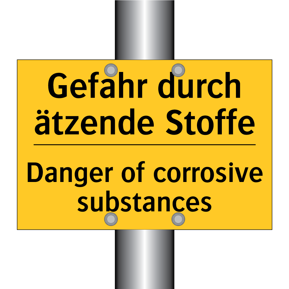 Zweisprachiges Warnschild mit deutschem Text Gefahr durch ätzende Stoffe und englischem Text Danger of corrosive substances