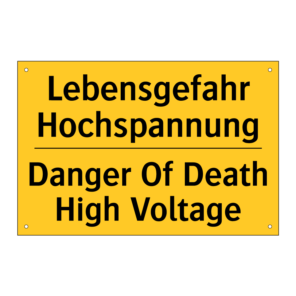 Zweisprachiges Warnschild mit deutschem Text Lebensgefahr Hochspannung und englischem Text Danger Of Death High Voltage