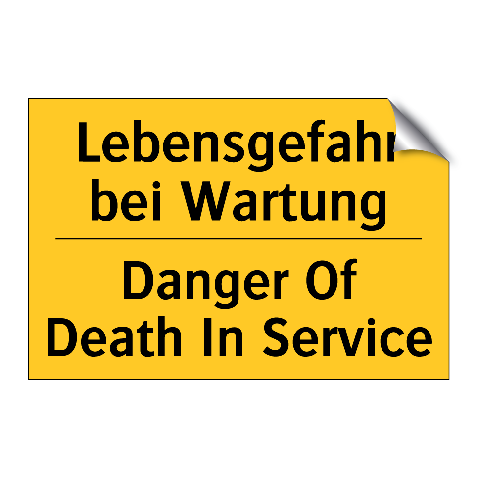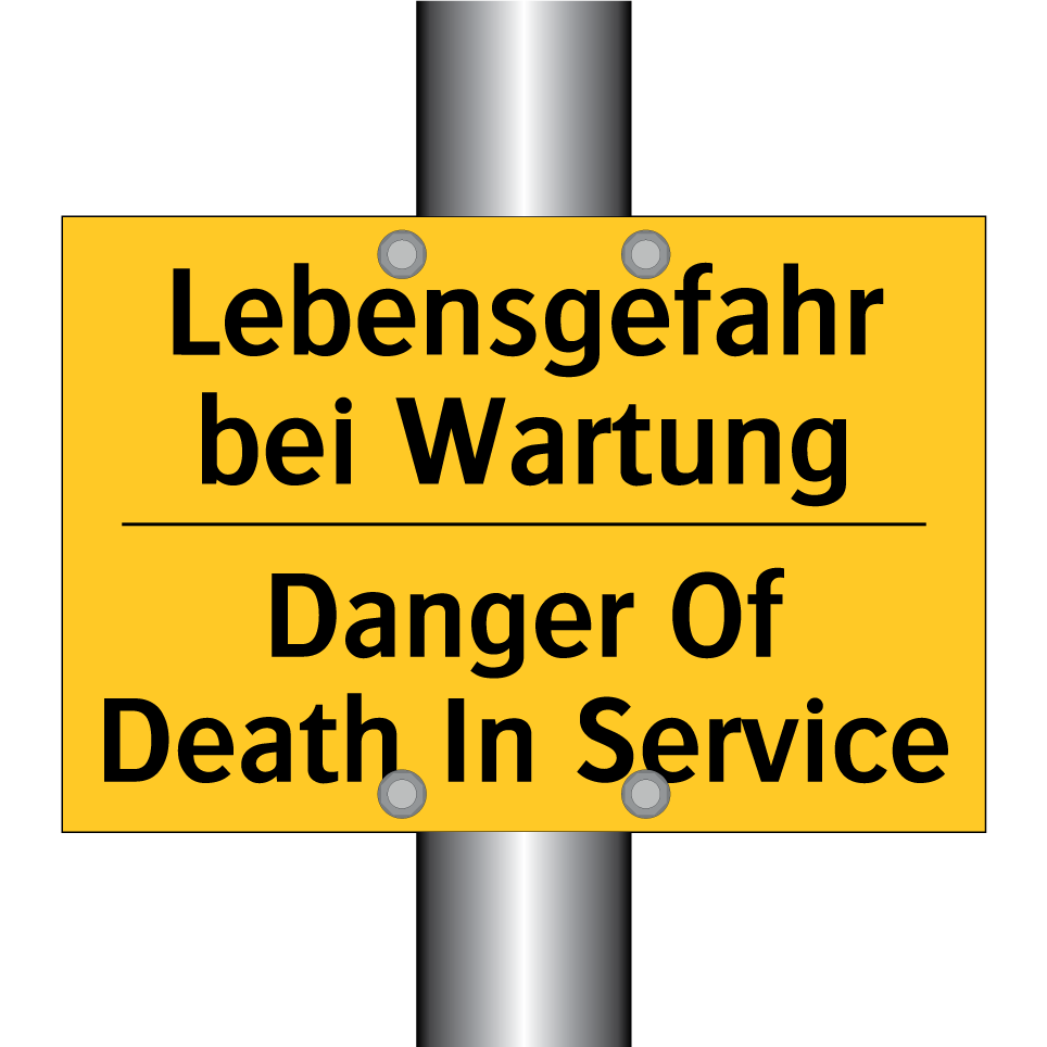 Zweisprachiges Warnschild mit deutschem Text Lebensgefahr bei Wartung und englischem Text Danger Of Death In Service