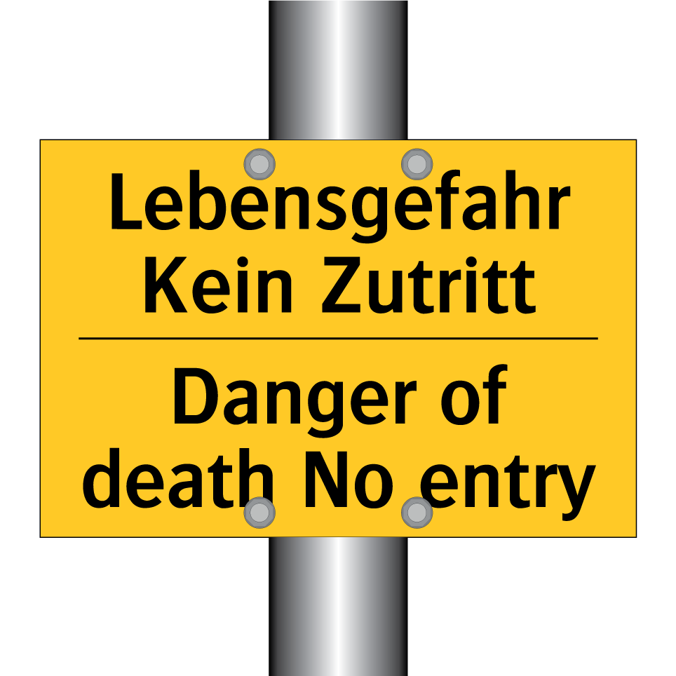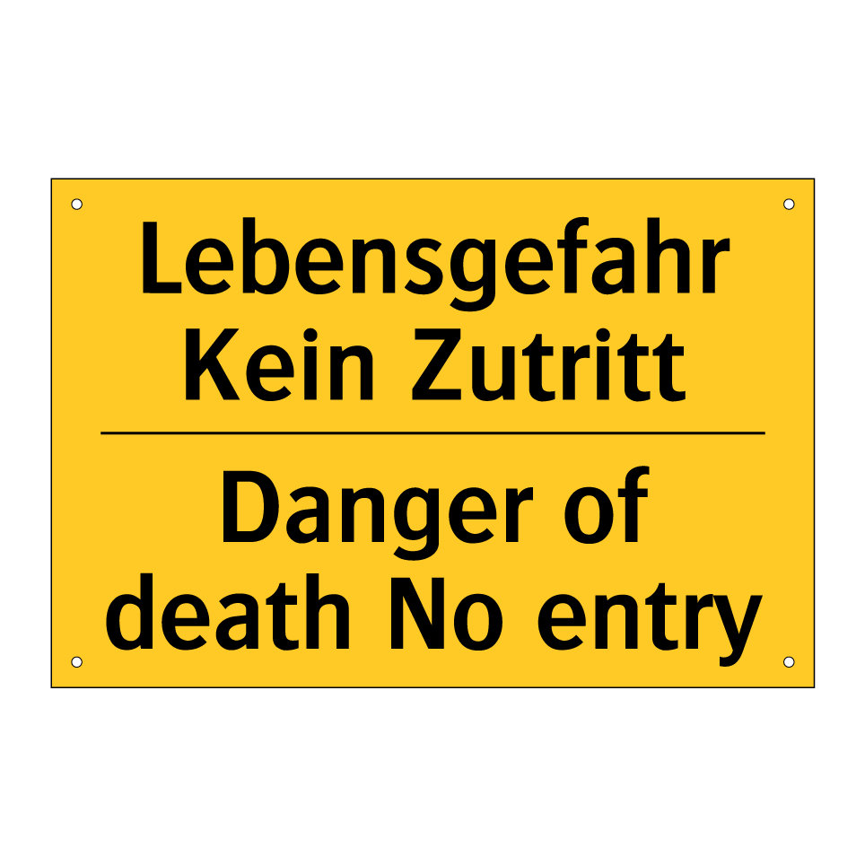 Zweisprachiges Warnschild mit deutschem Text Lebensgefahr Kein Zutritt und englischem Text Danger of death No entry