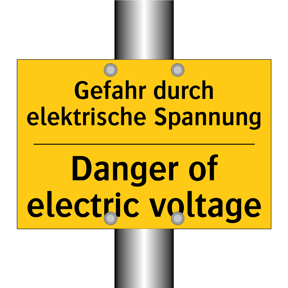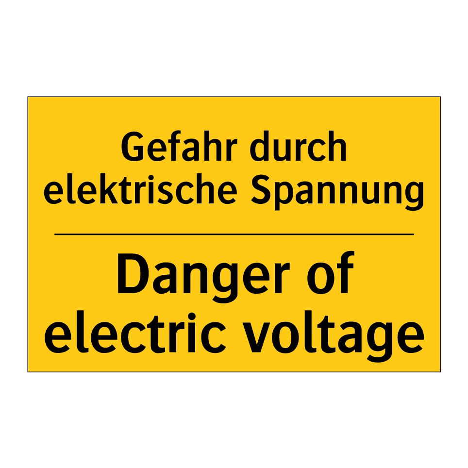 Zweisprachiges Warnschild mit deutschem Text Gefahr durch elektrische Spannung und englischem Text Danger of electric voltage