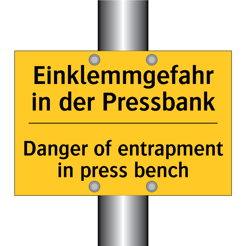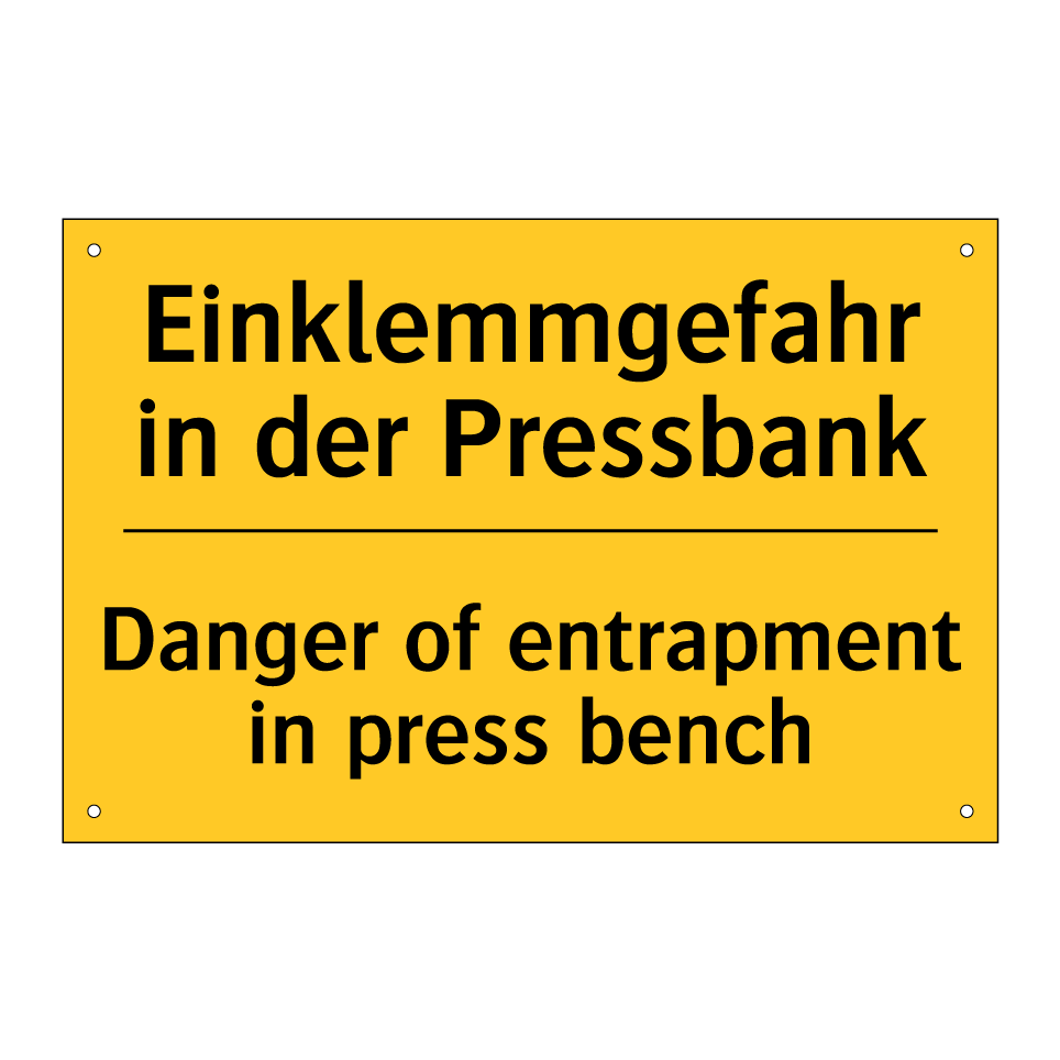 Zweisprachiges Warnschild mit deutschem Text Einklemmgefahr in der Pressbank und englischem Text Danger of entrapment in press bench