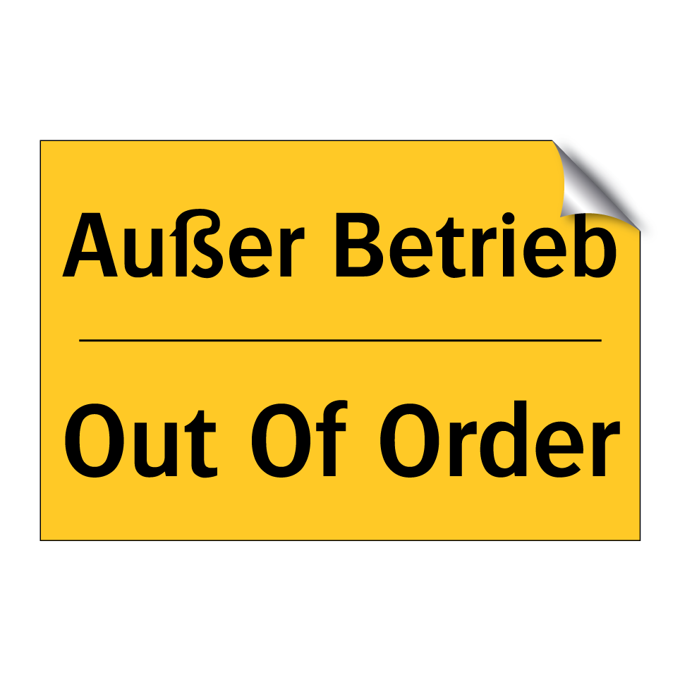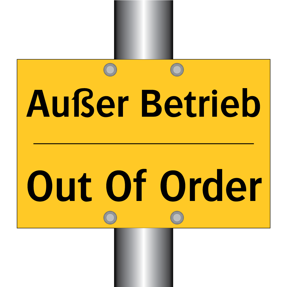 Zweisprachiges Warnschild mit deutschem Text Außer Betrieb und englischem Text Out Of Order