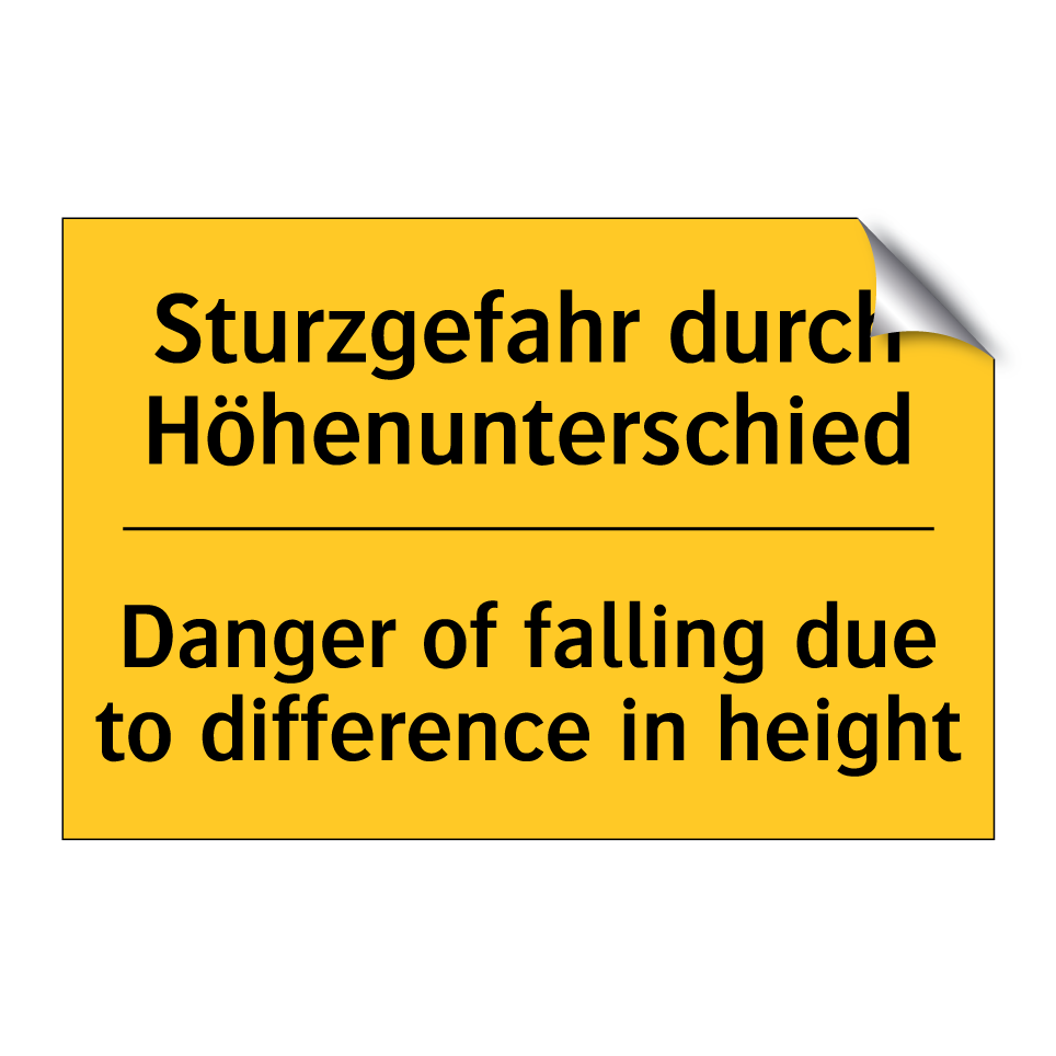 Diese Warnschild mit gelbem Hintergrund und schwarzem Text ist ideal, um auf potenzielle Sturzgefahren durch Höhenunterschiede hinzuweisen. Dank der zweisprachigen Beschriftung auf Deutsch und Englisch eignet sich das Schild hervorragend für internationale Umgebungen, in denen sowohl deutsch- als auch englischsprachige Personen unterwegs sind. Platzieren Sie es an Orten wie Baustellen, Lagerhäusern oder öffentlichen Treppen, um die Sicherheit zu erhöhen und Unfälle zu vermeiden. Die klare und deutliche Darstellung der Warnung sorgt dafür, dass die Botschaft schnell und effektiv vermittelt wird. Nutzen Sie dieses Warnschild, um Ihre Umgebung sicherer zu gestalten und das Bewusstsein für mögliche Gefahren zu schärfen.