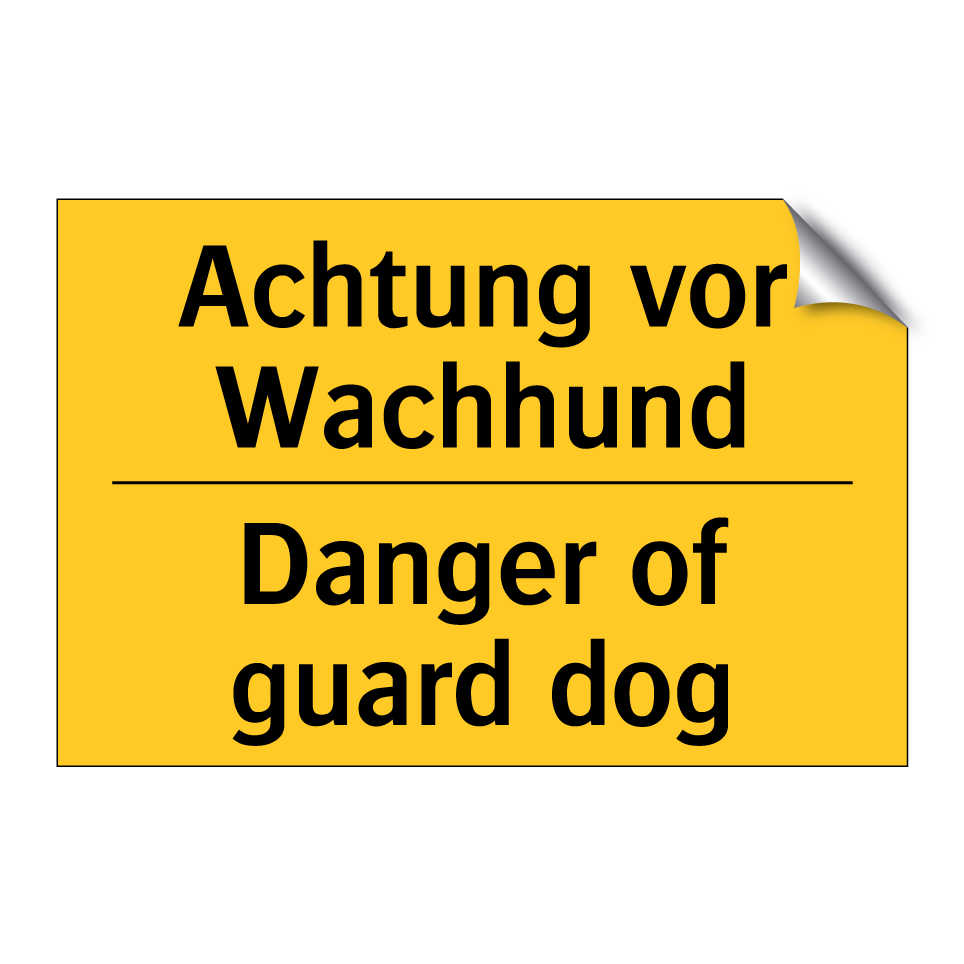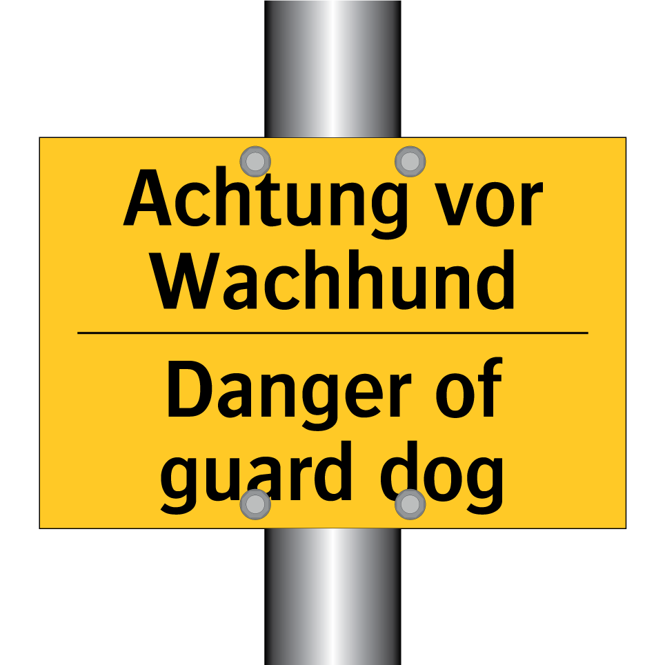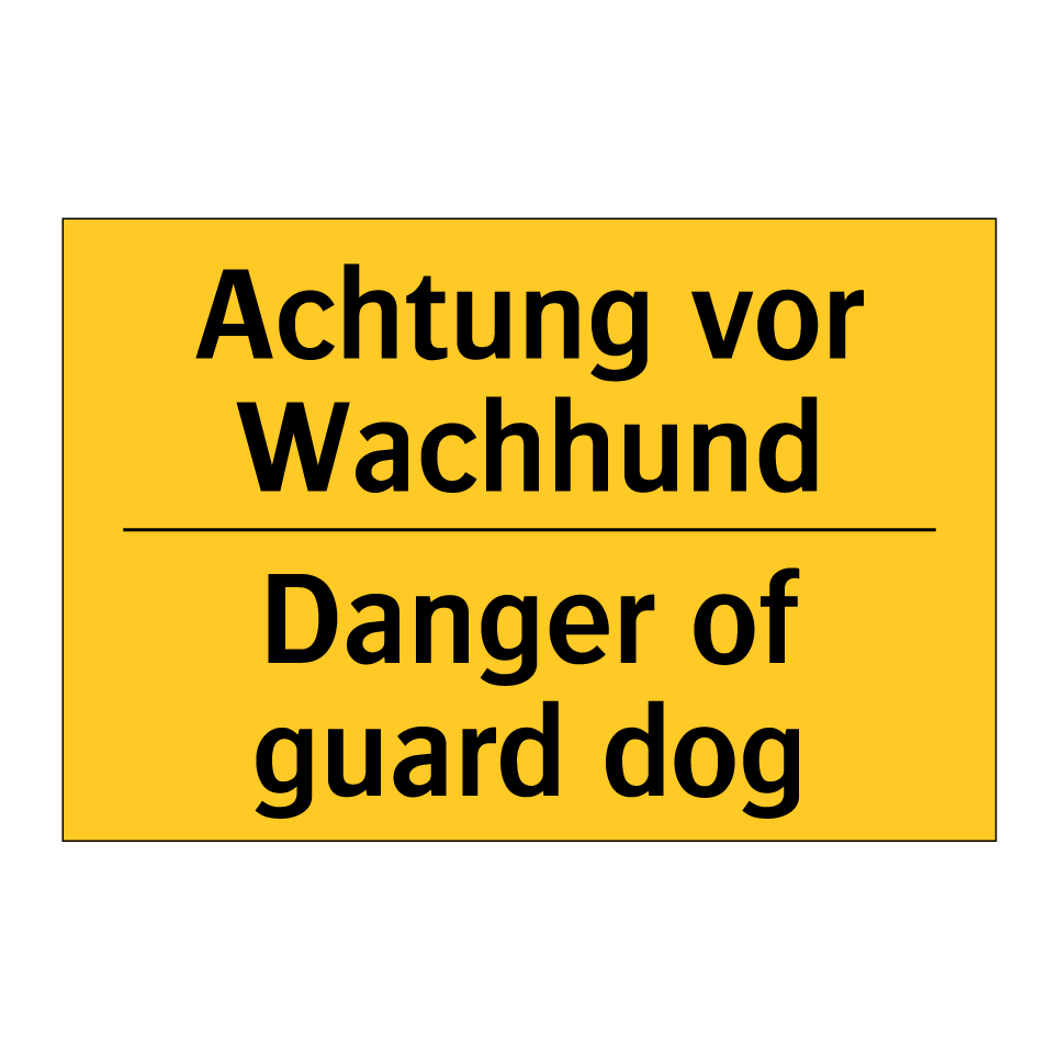 Zweisprachiges Warnschild mit deutschem Text Achtung vor Wachhund und englischem Text Danger of guard dog