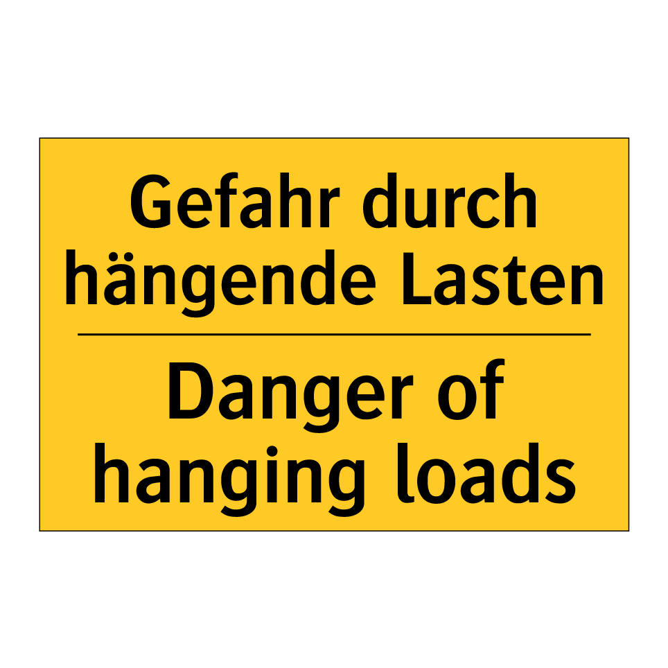Zweisprachiges Warnschild mit deutschem Text Gefahr durch hängende Lasten und englischem Text Danger of hanging loads
