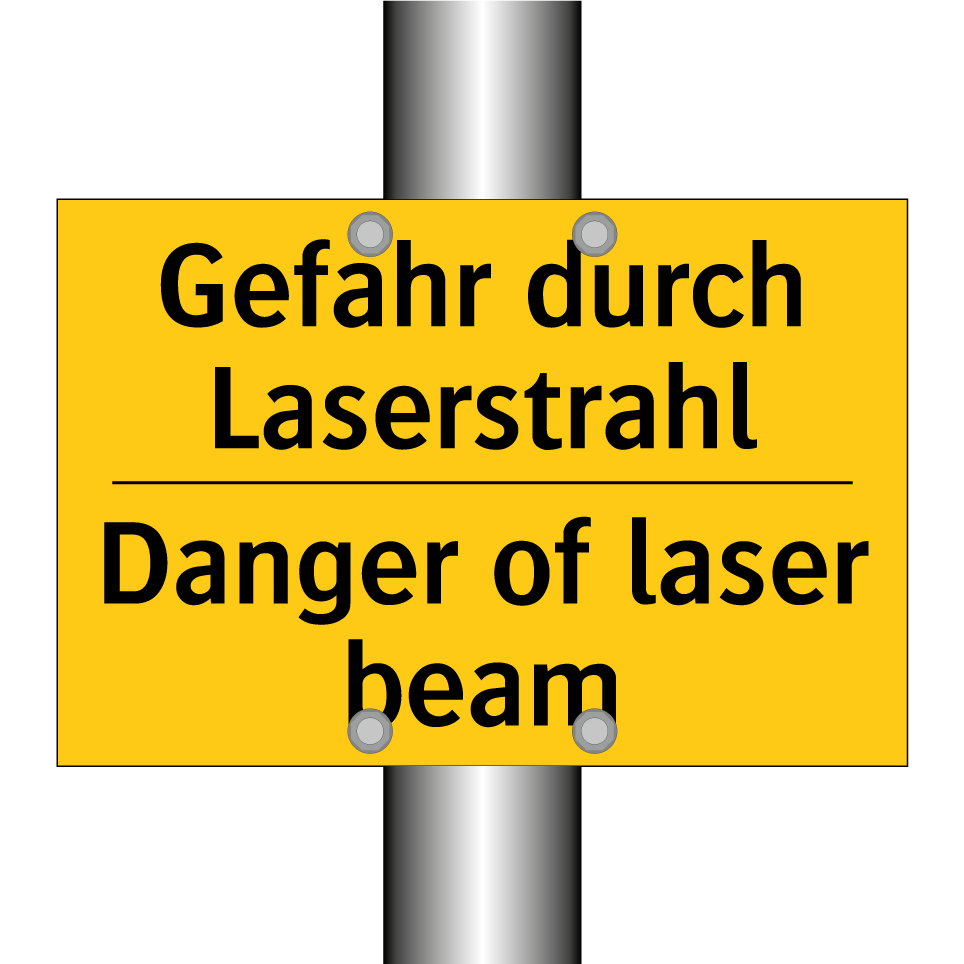 Zweisprachiges Warnschild mit deutschem Text Gefahr durch Laserstrahl und englischem Text Danger of laser beam