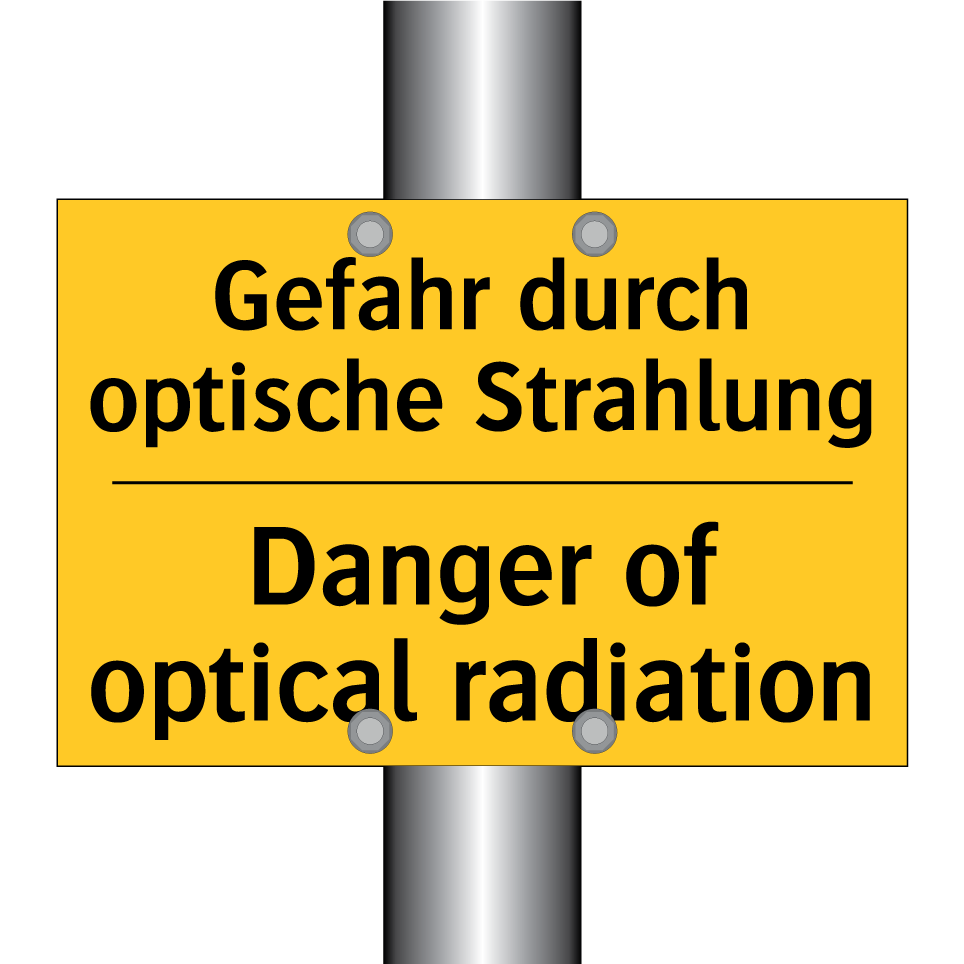 Zweisprachiges Warnschild mit deutschem Text Gefahr durch optische Strahlung und englischem Text Danger of optical radiation