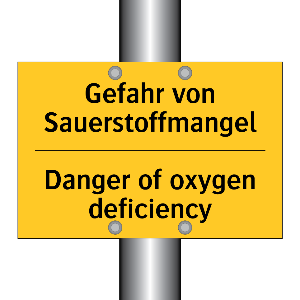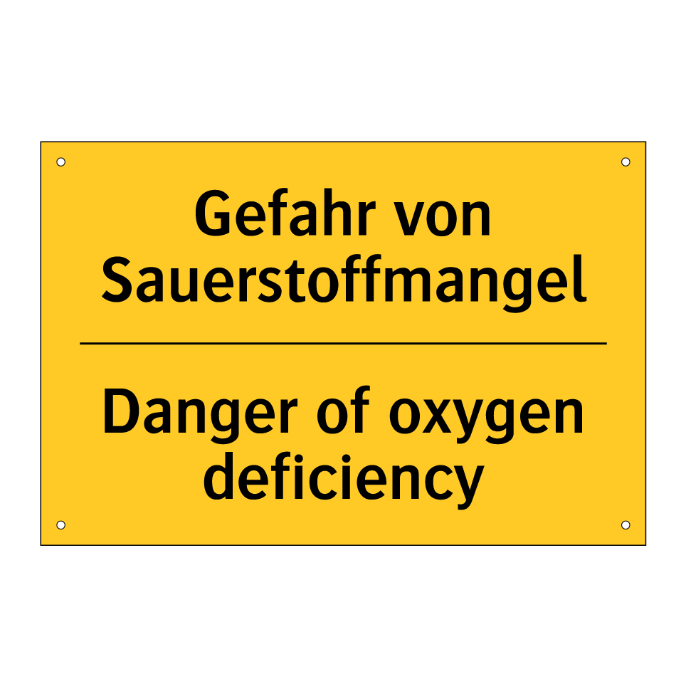 Zweisprachiges Warnschild mit deutschem Text Gefahr von Sauerstoffmangel und englischem Text Danger of oxygen deficiency