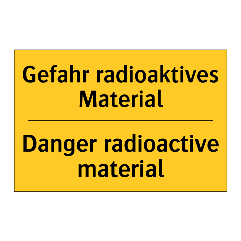 Zweisprachiges Warnschild mit deutschem Text Gefahr radioaktives Material und englischem Text Danger radioactive material