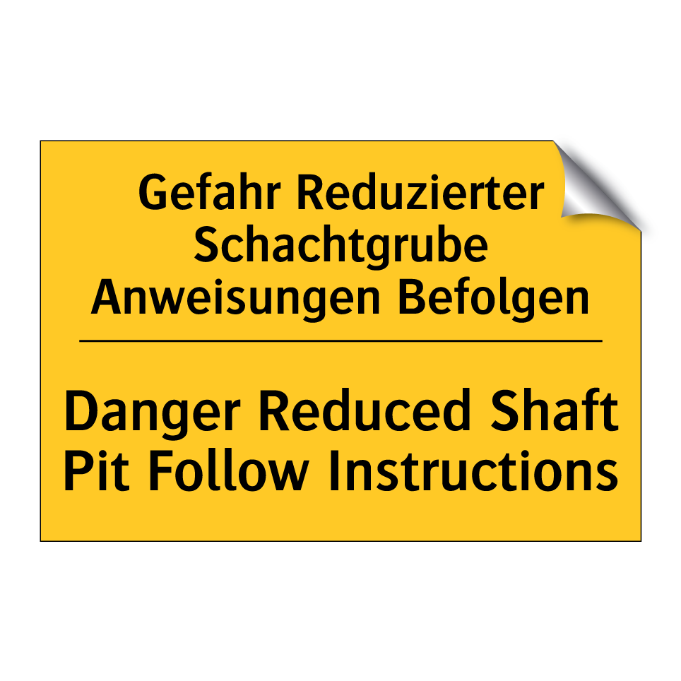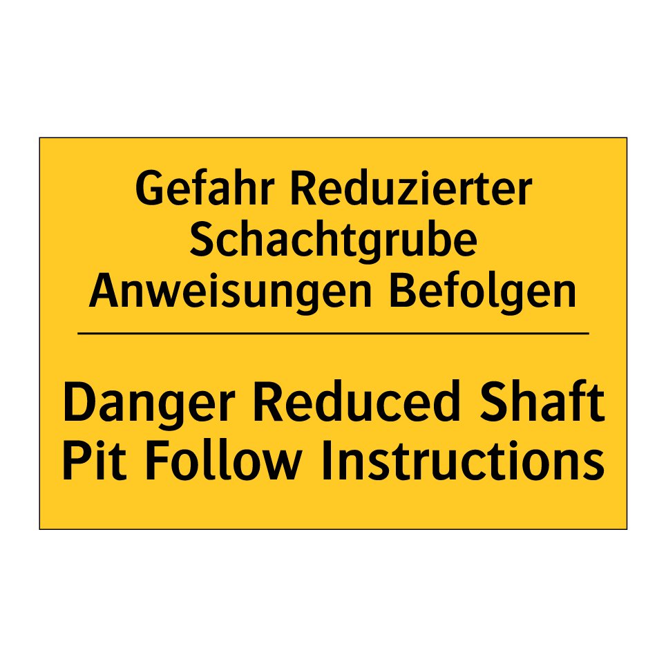 Zweisprachiges Warnschild mit deutschem Text Gefahr Reduzierter Schachtgrube Anweisungen Befolgen und englischem Text Danger Reduced Shaft Pit Follow Instructions