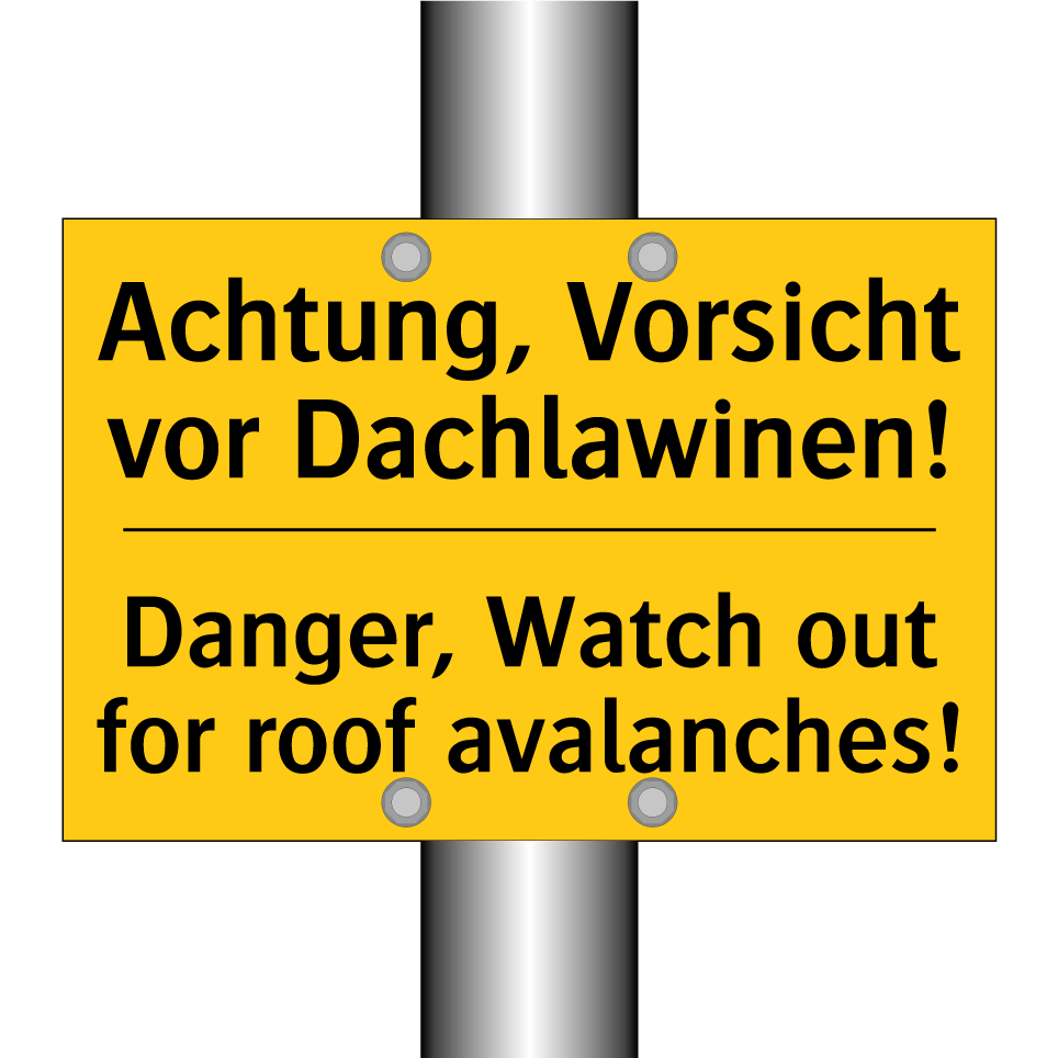Zweisprachiges Warnschild mit deutschem Text Achtung, Vorsicht vor Dachlawinen! und englischem Text Danger, Watch out for roof avalanches!