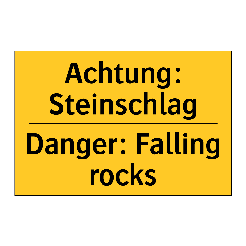 Zweisprachiges Warnschild mit deutschem Text Achtung: Steinschlag und englischem Text Danger: Falling rocks