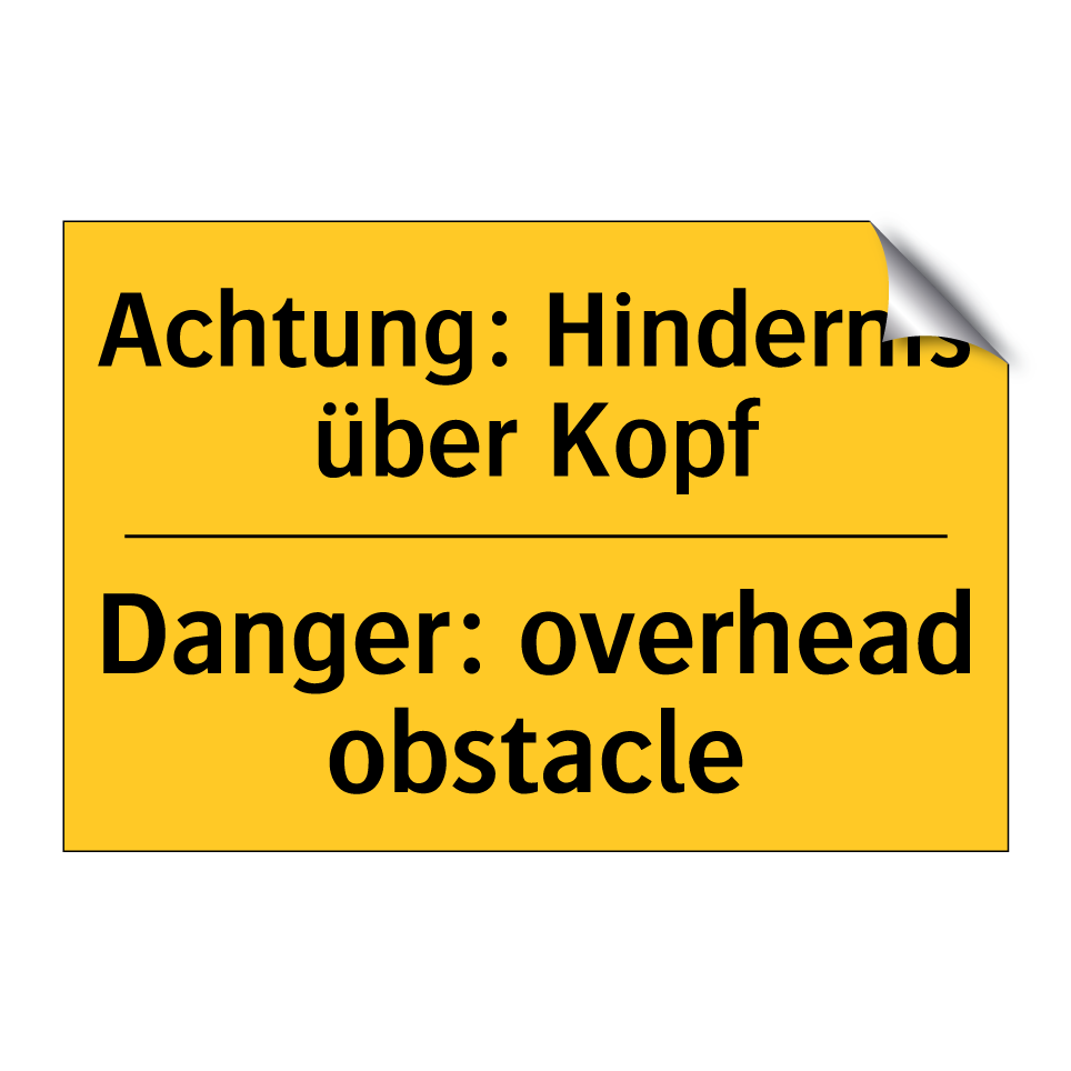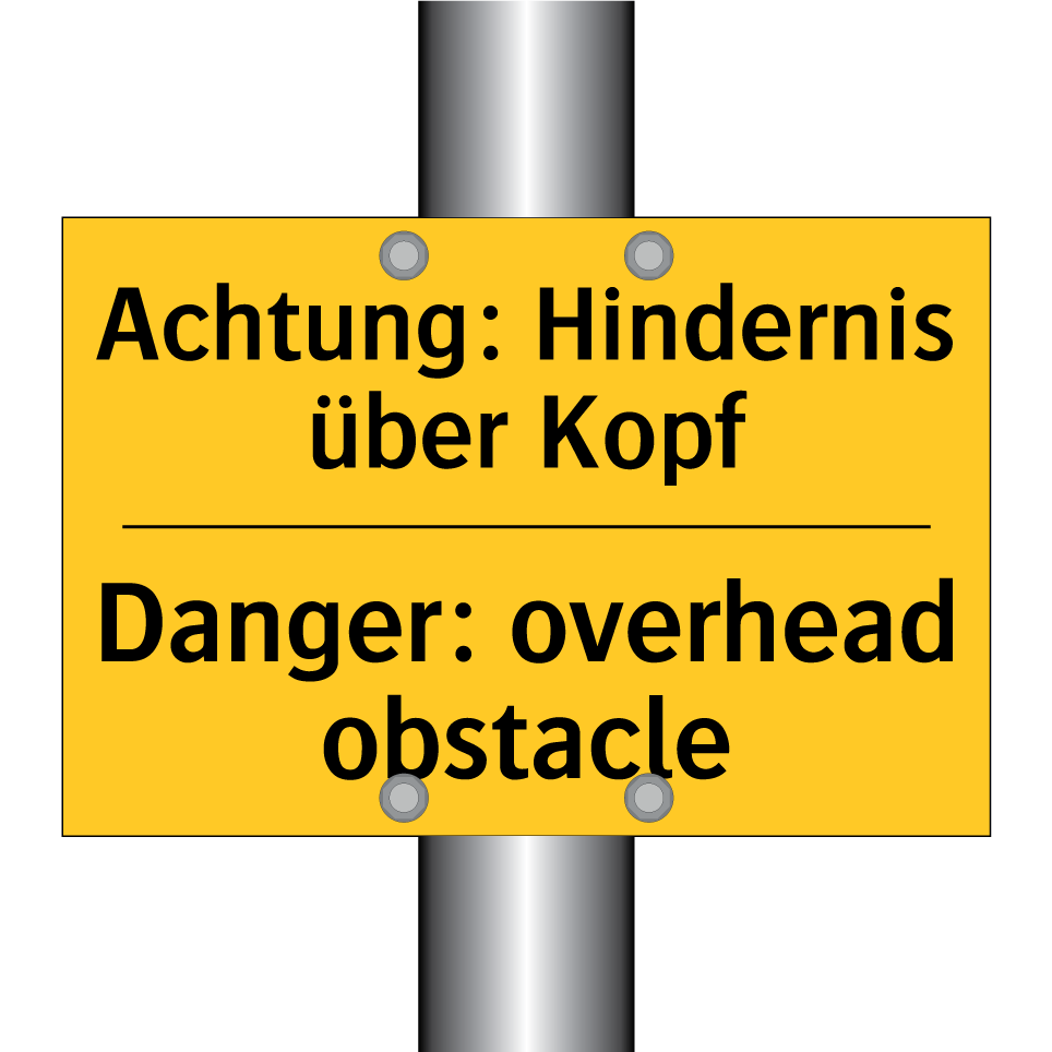 Zweisprachiges Warnschild mit deutschem Text Achtung: Hindernis über Kopf und englischem Text Danger: overhead obstacle