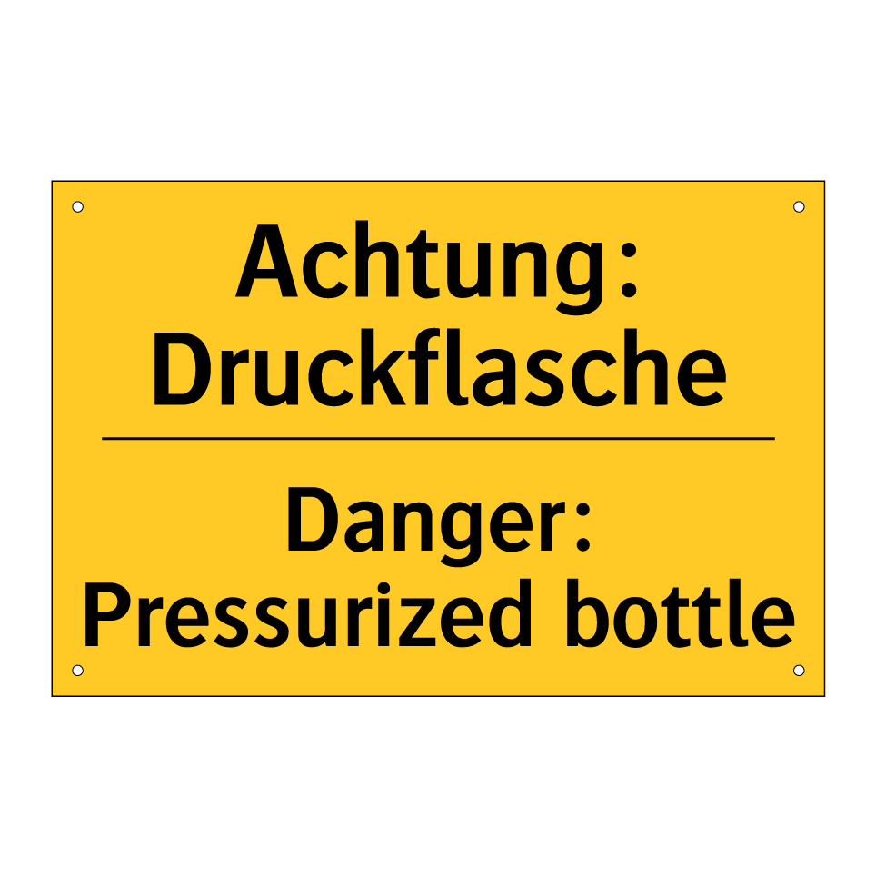 Zweisprachiges Warnschild mit deutschem Text Achtung: Druckflasche und englischem Text Danger: Pressurized bottle