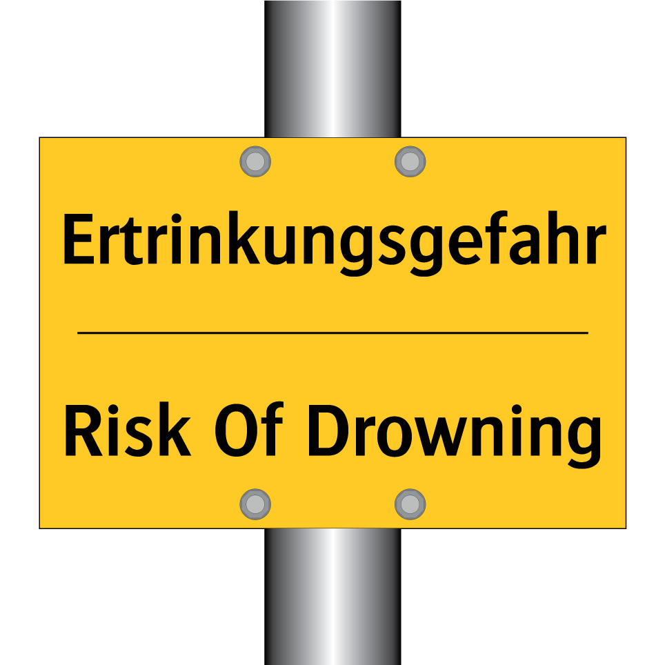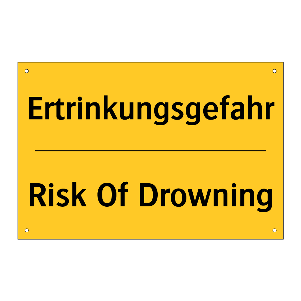 Zweisprachiges Warnschild mit deutschem Text Ertrinkungsgefahr und englischem Text Risk Of Drowning