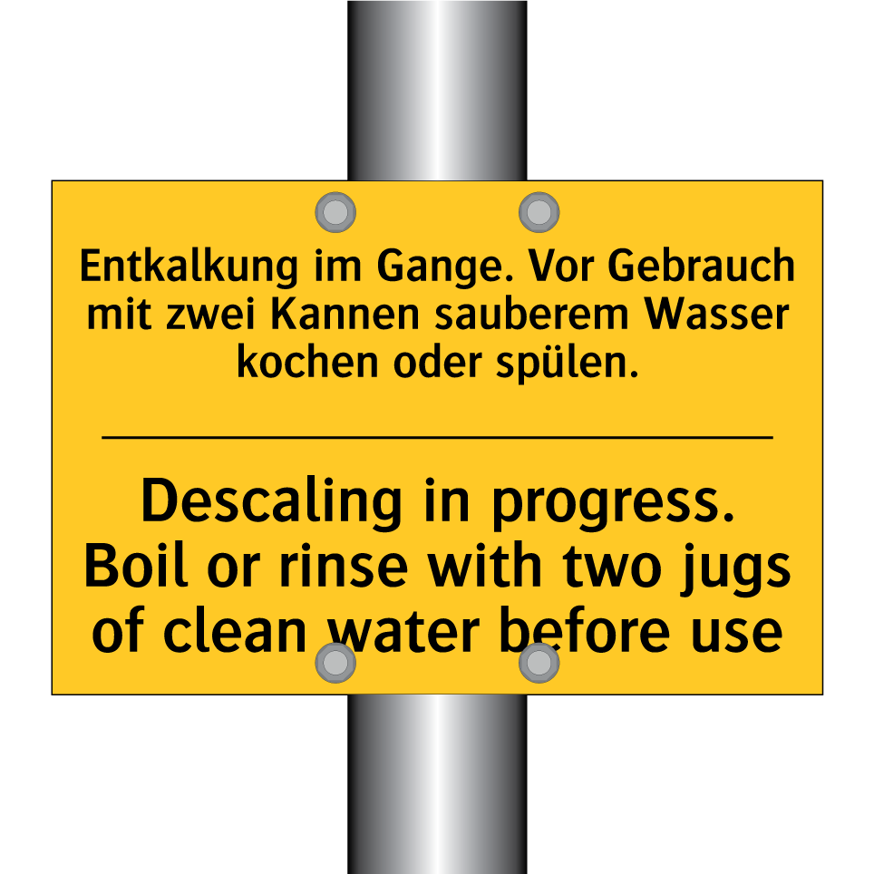 Zweisprachiges Warnschild mit deutschem Text Entkalkung im Gange. Vor Gebrauch mit zwei Kannen sauberem Wasser kochen oder spülen. und englischem Text Descaling in progress. Boil or rinse with two jugs of clean water before use