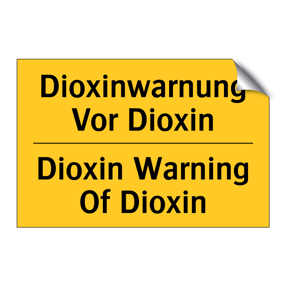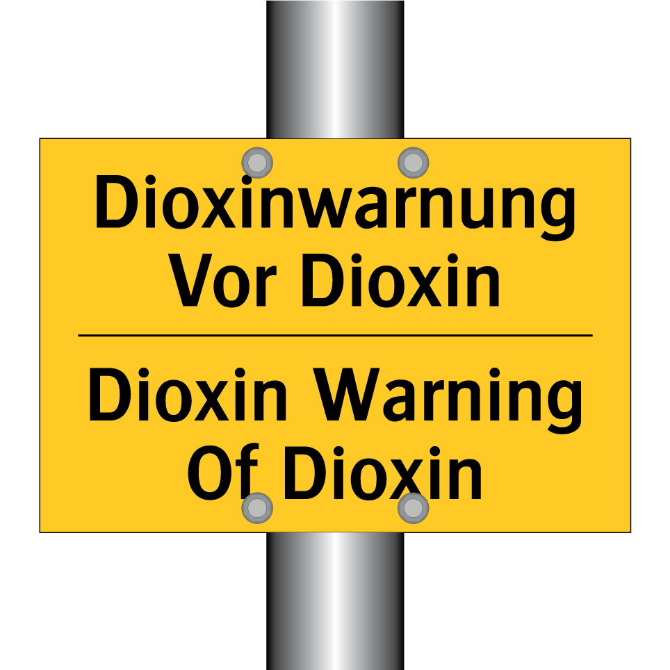 Zweisprachiges Warnschild mit deutschem Text Dioxinwarnung Vor Dioxin und englischem Text Dioxin Warning Of Dioxin