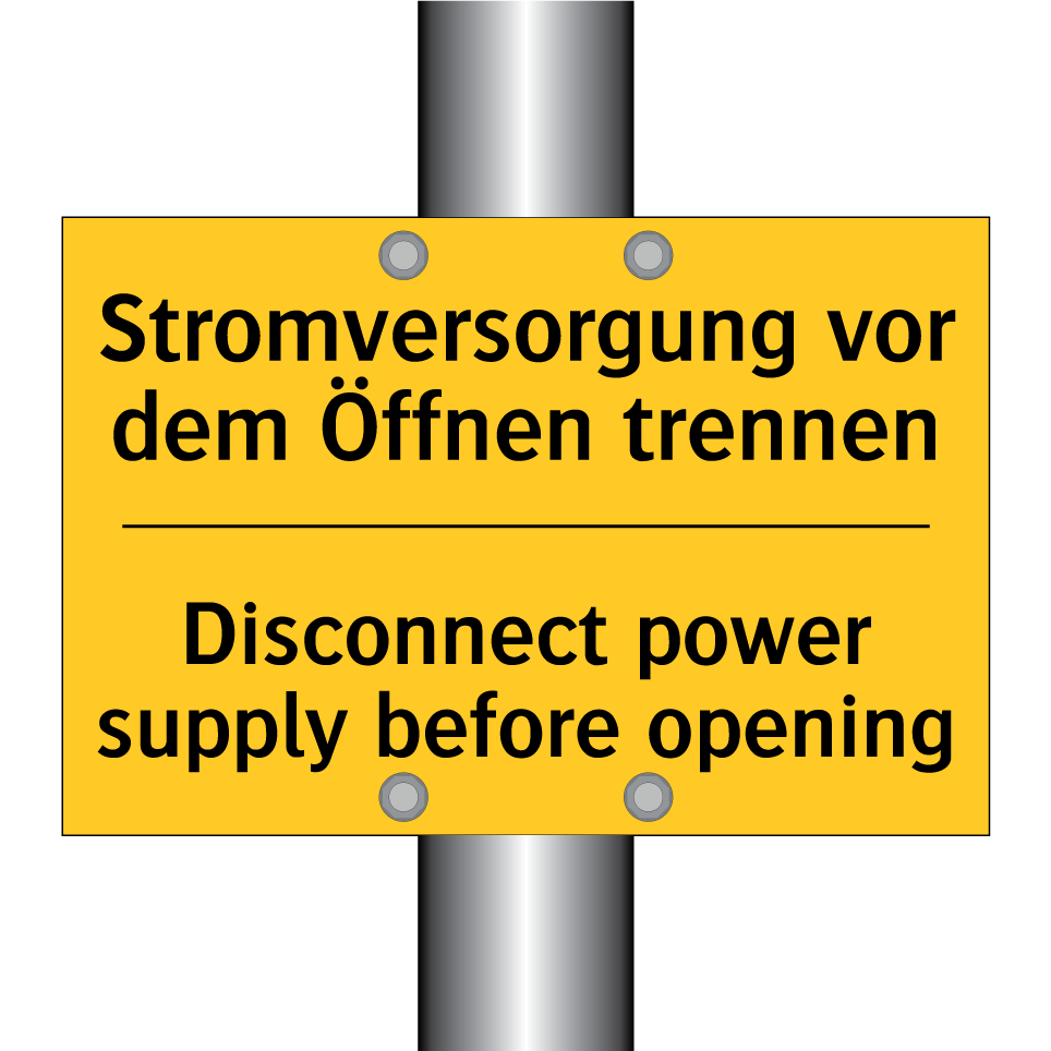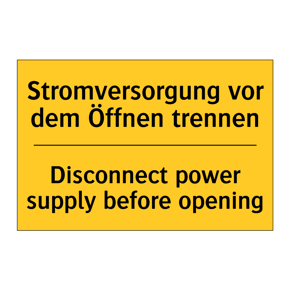 Zweisprachiges Warnschild mit deutschem Text Stromversorgung vor dem Öffnen trennen und englischem Text Disconnect power supply before opening