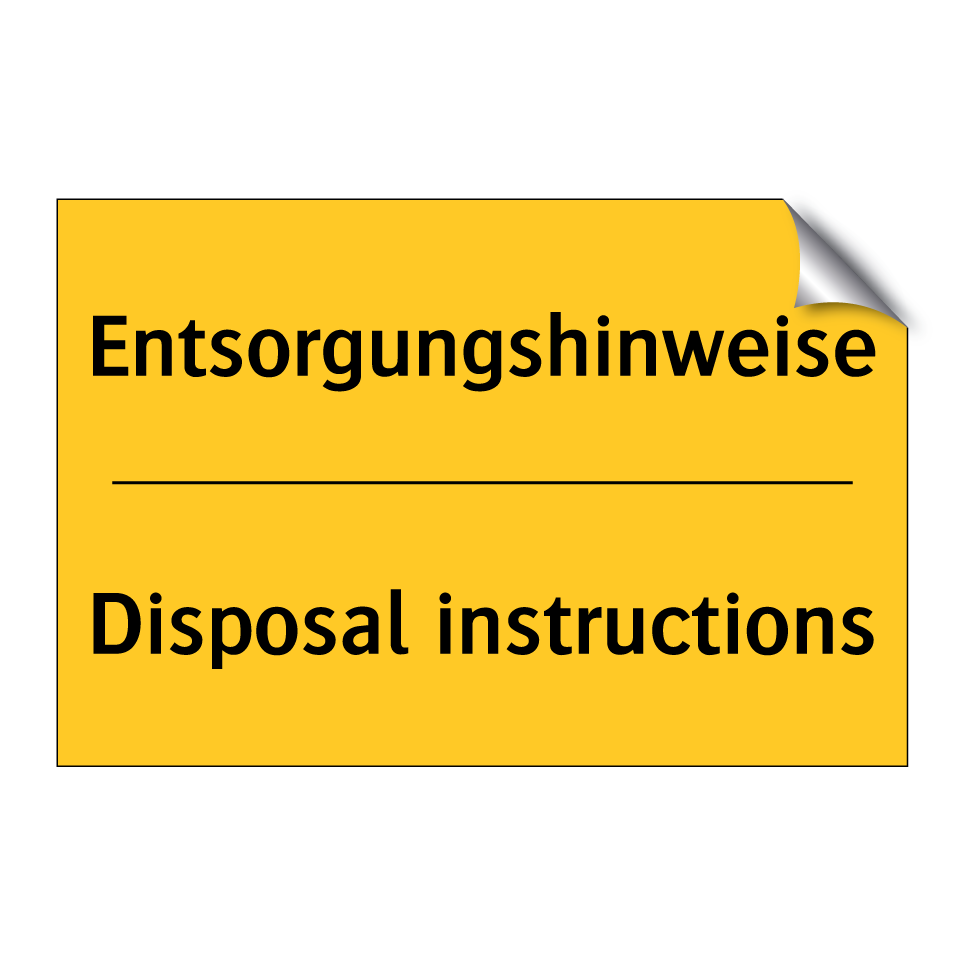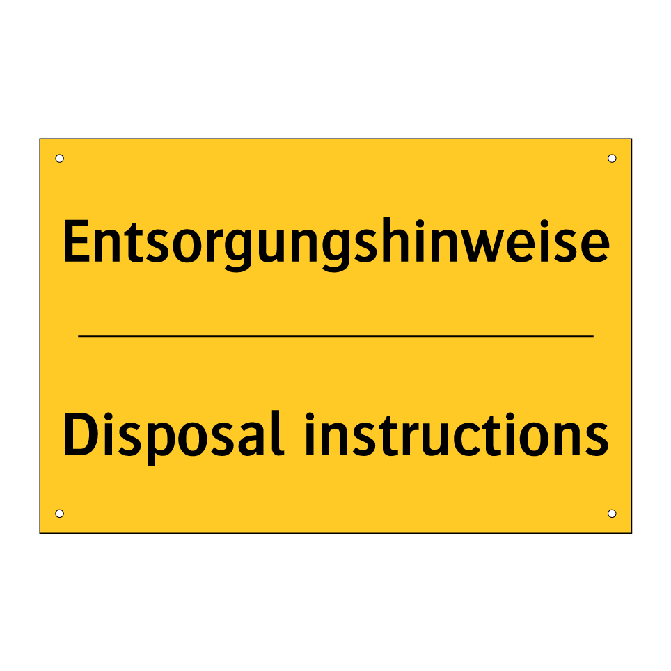 Zweisprachiges Warnschild mit deutschem Text Entsorgungshinweise und englischem Text Disposal instructions