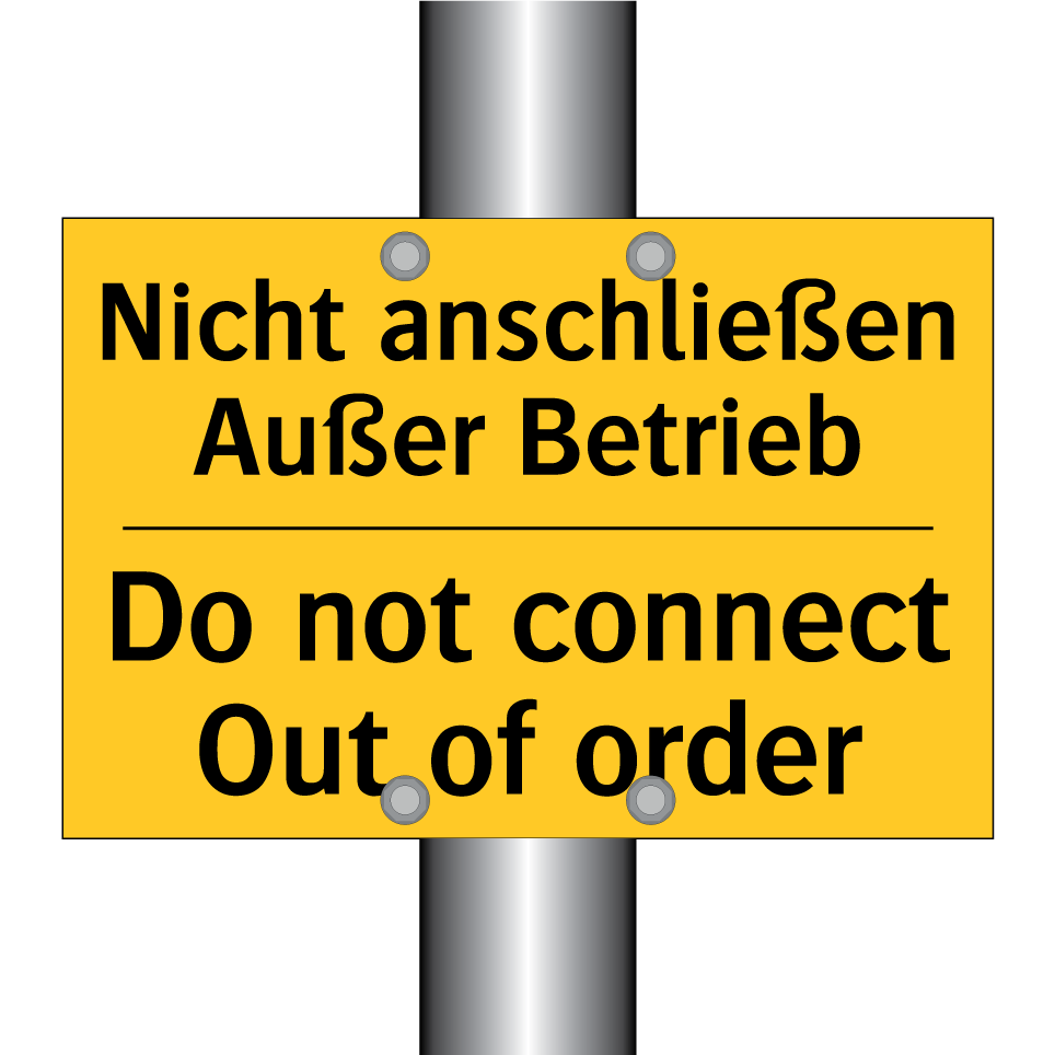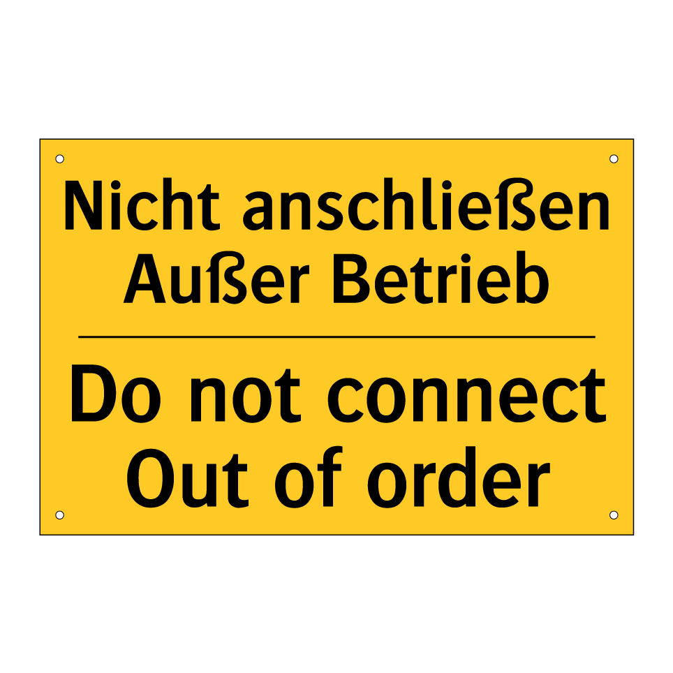 Zweisprachiges Warnschild mit deutschem Text Nicht anschließen Außer Betrieb und englischem Text Do not connect Out of order