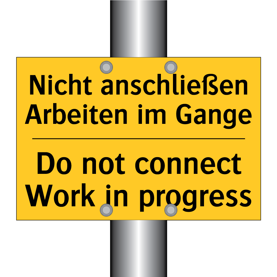 Zweisprachiges Warnschild mit deutschem Text Nicht anschließen Arbeiten im Gange und englischem Text Do not connect Work in progress