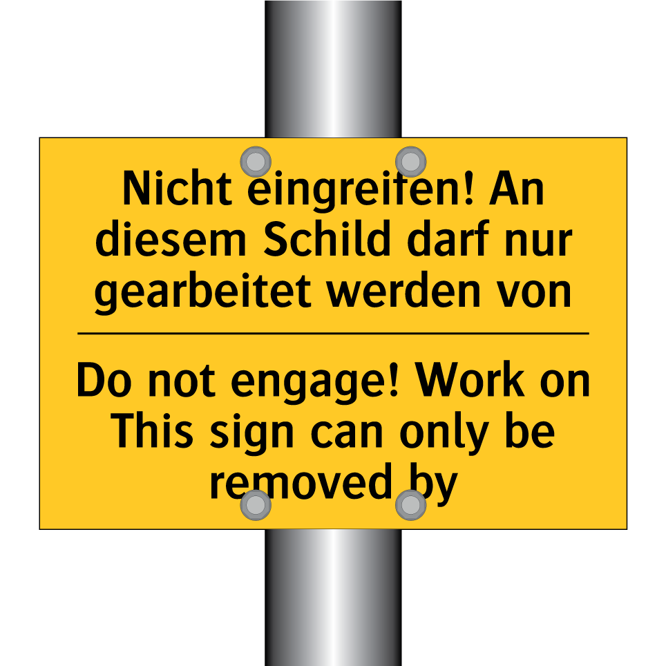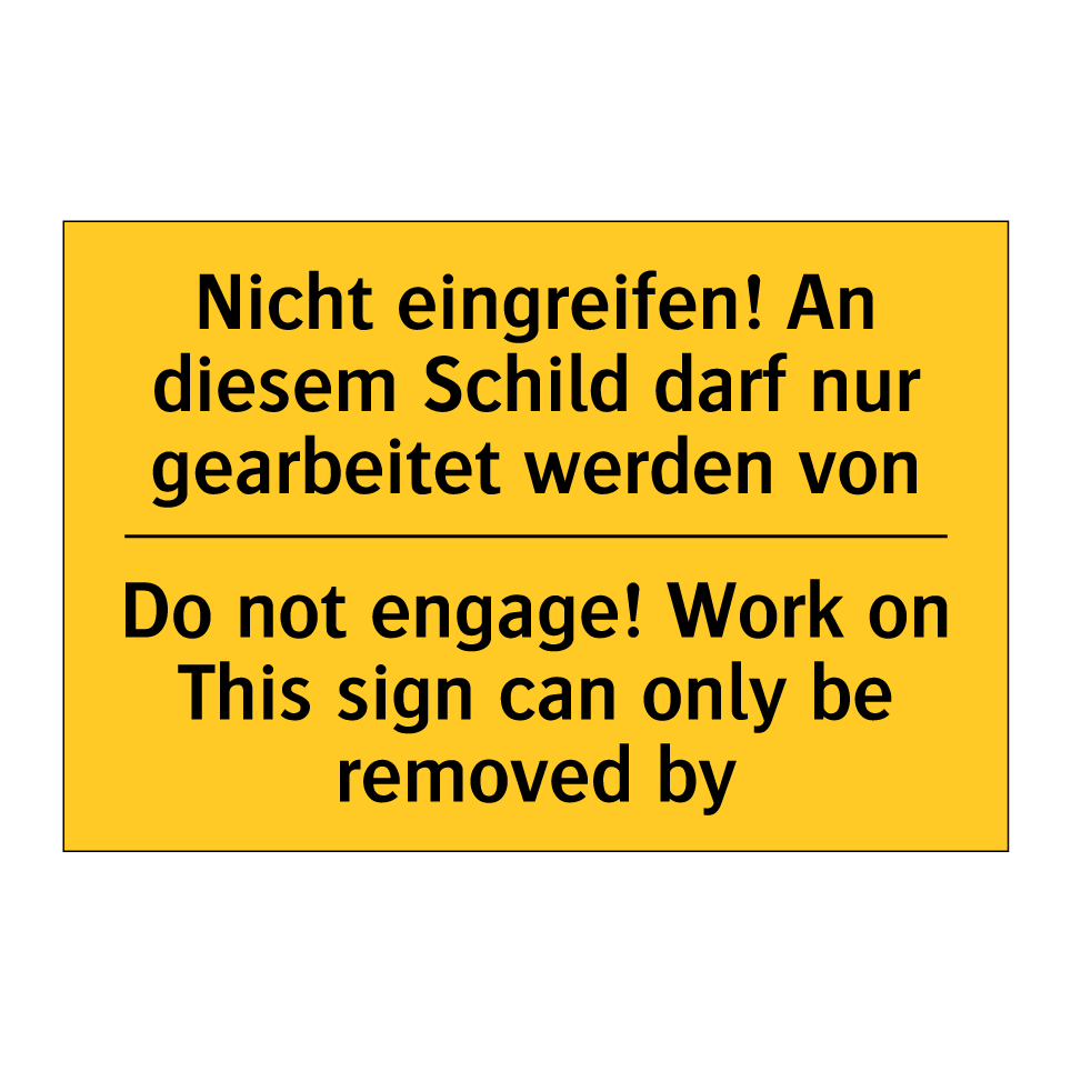 Zweisprachiges Warnschild mit deutschem Text Nicht eingreifen! An diesem Schild darf nur gearbeitet werden von und englischem Text Do not engage! Work on This sign can only be removed by
