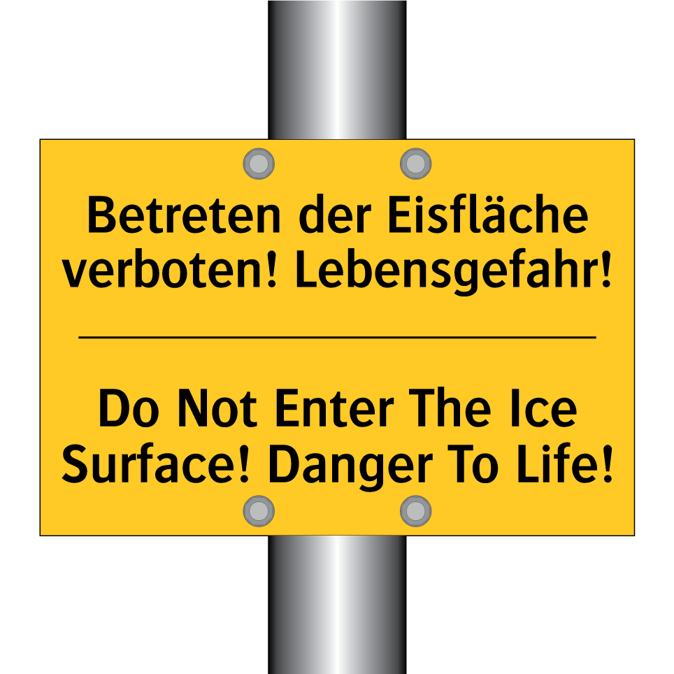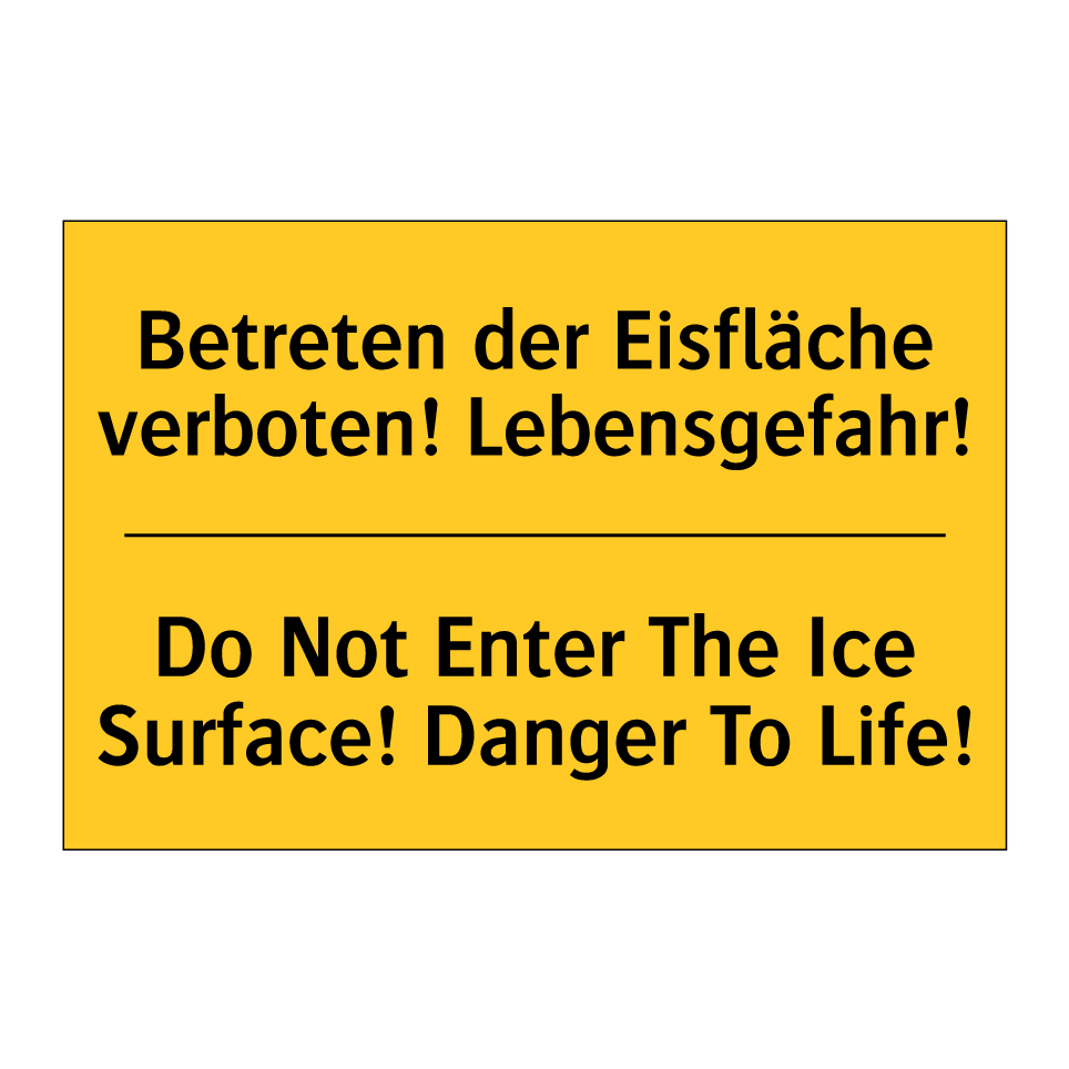 Zweisprachiges Warnschild mit deutschem Text Betreten der Eisfläche verboten! Lebensgefahr! und englischem Text Do Not Enter The Ice Surface! Danger To Life!