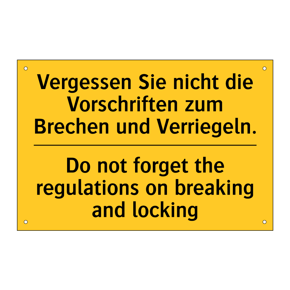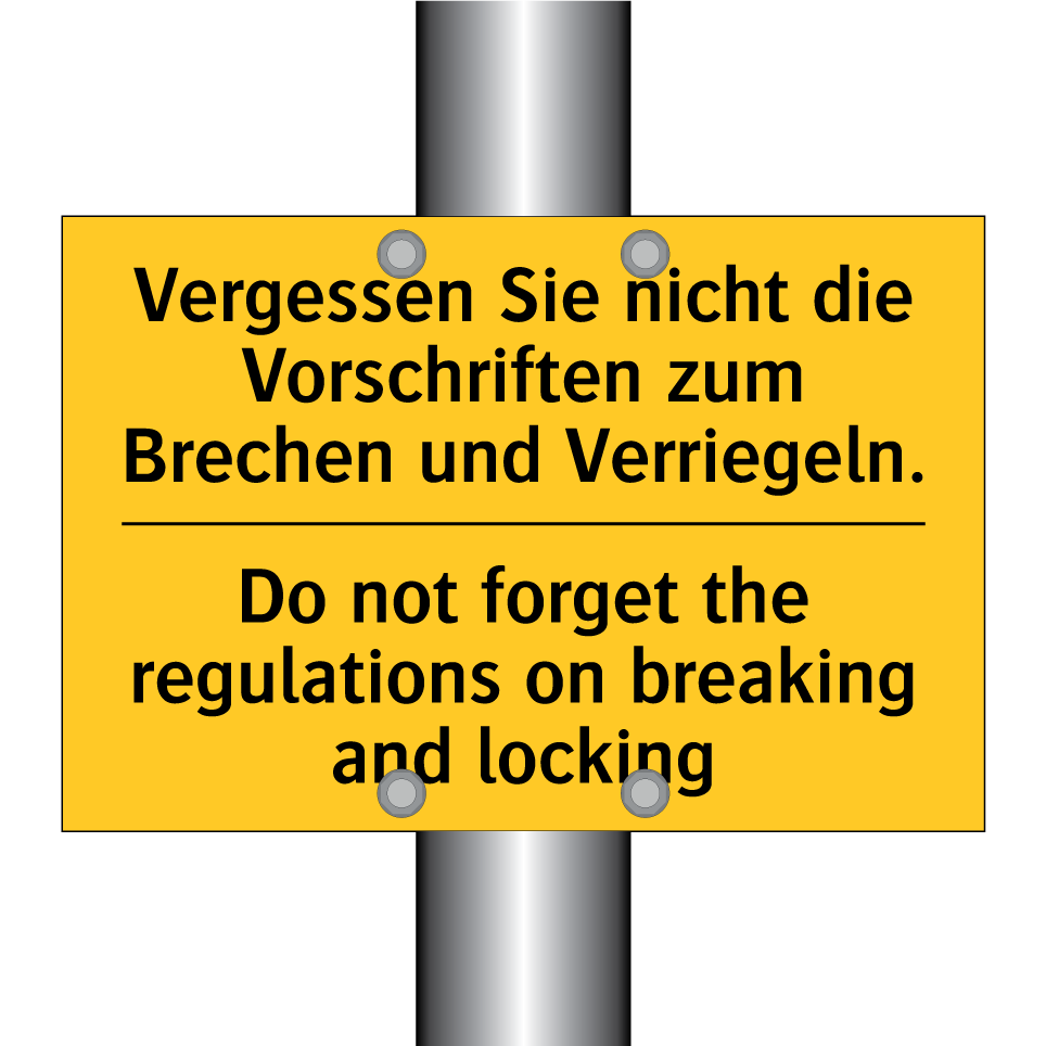 Zweisprachiges Warnschild mit deutschem Text Vergessen Sie nicht die Vorschriften zum Brechen und Verriegeln. und englischem Text Do not forget the regulations on breaking and locking