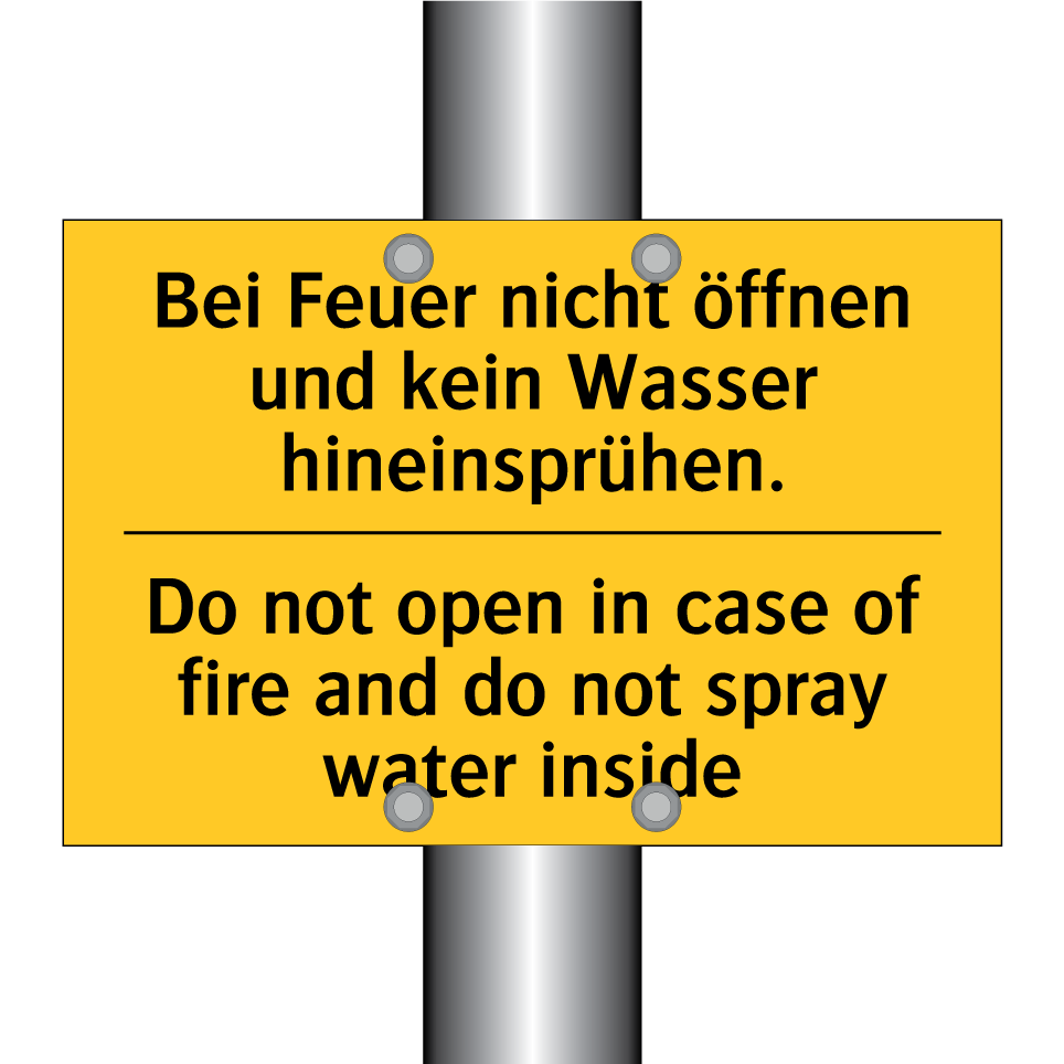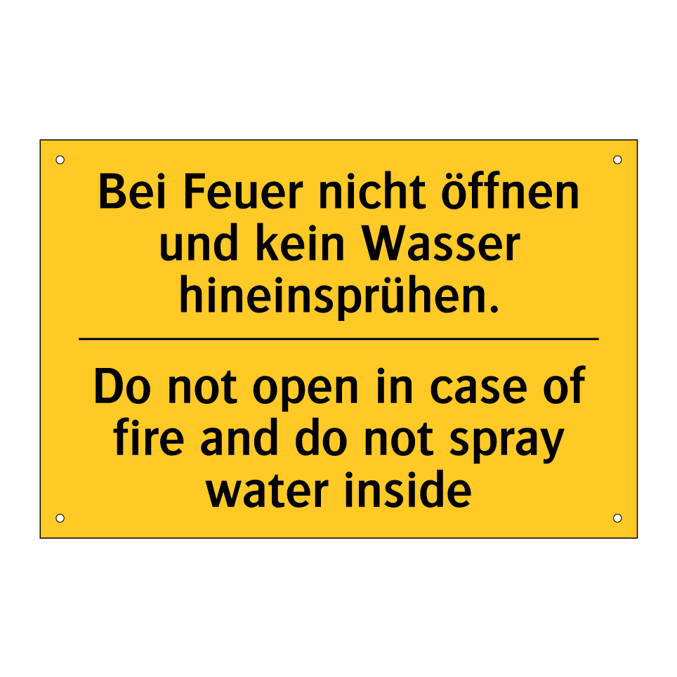 Zweisprachiges Warnschild mit deutschem Text Bei Feuer nicht öffnen und kein Wasser hineinsprühen. und englischem Text Do not open in case of fire and do not spray water inside