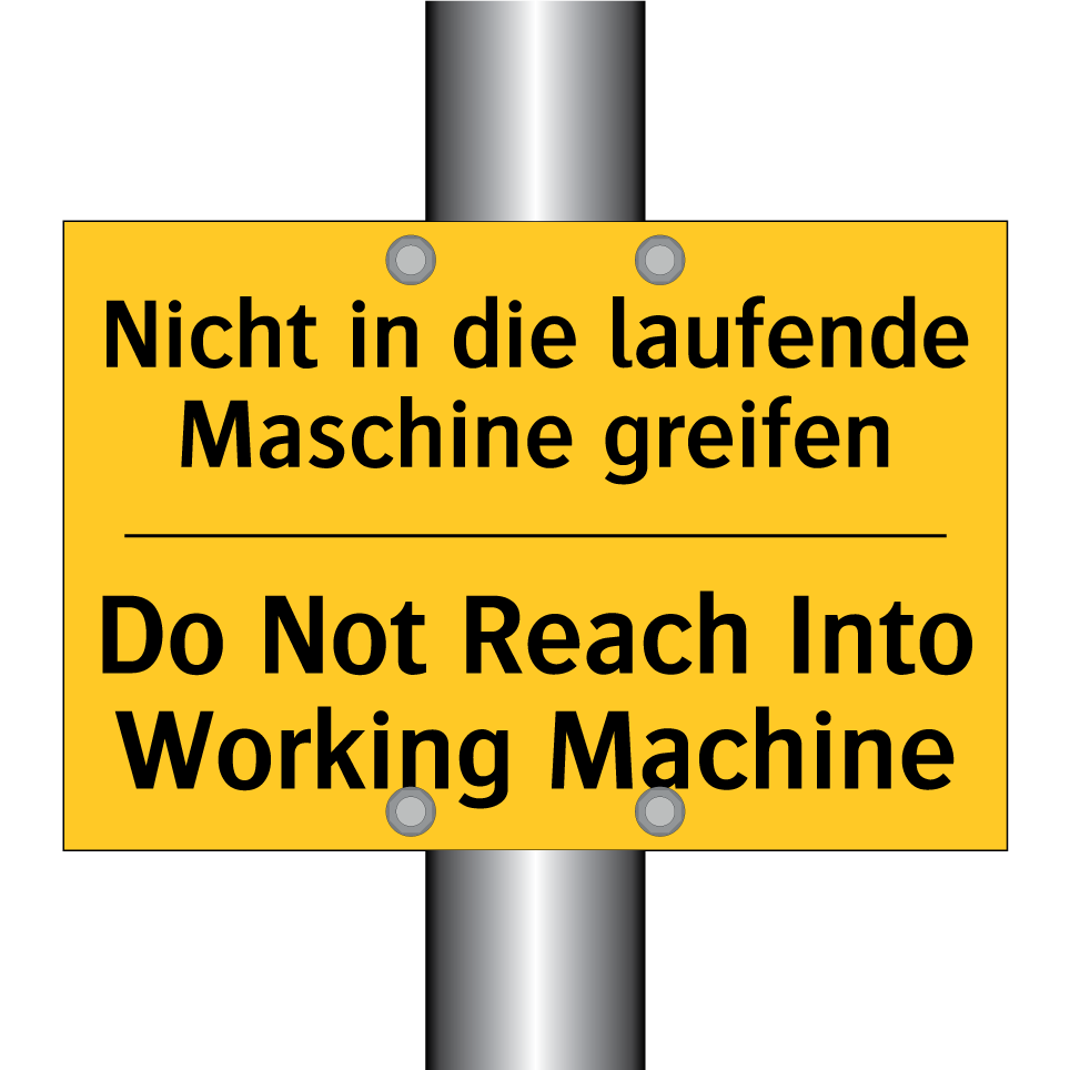 Zweisprachiges Warnschild mit deutschem Text Nicht in die laufende Maschine greifen und englischem Text Do Not Reach Into Working Machine