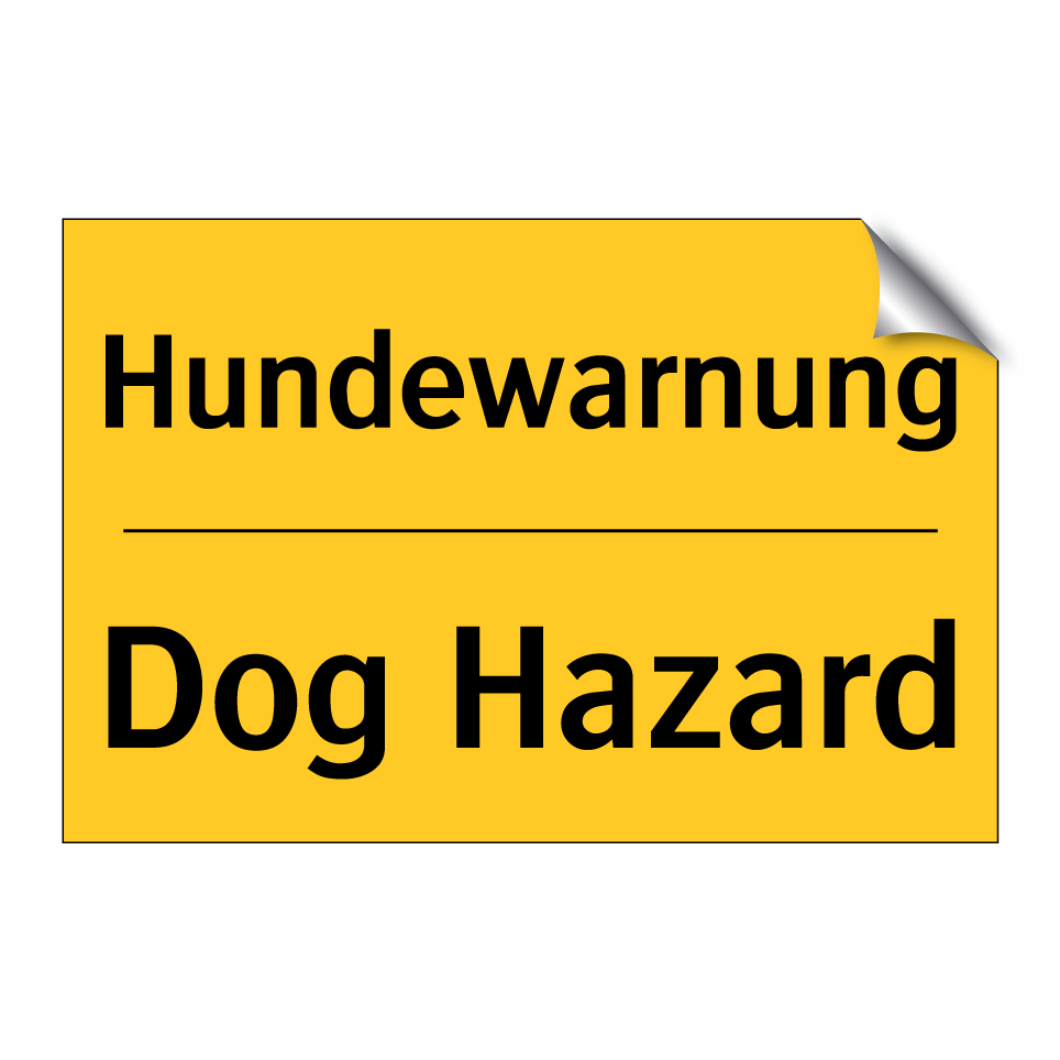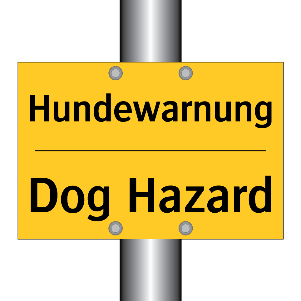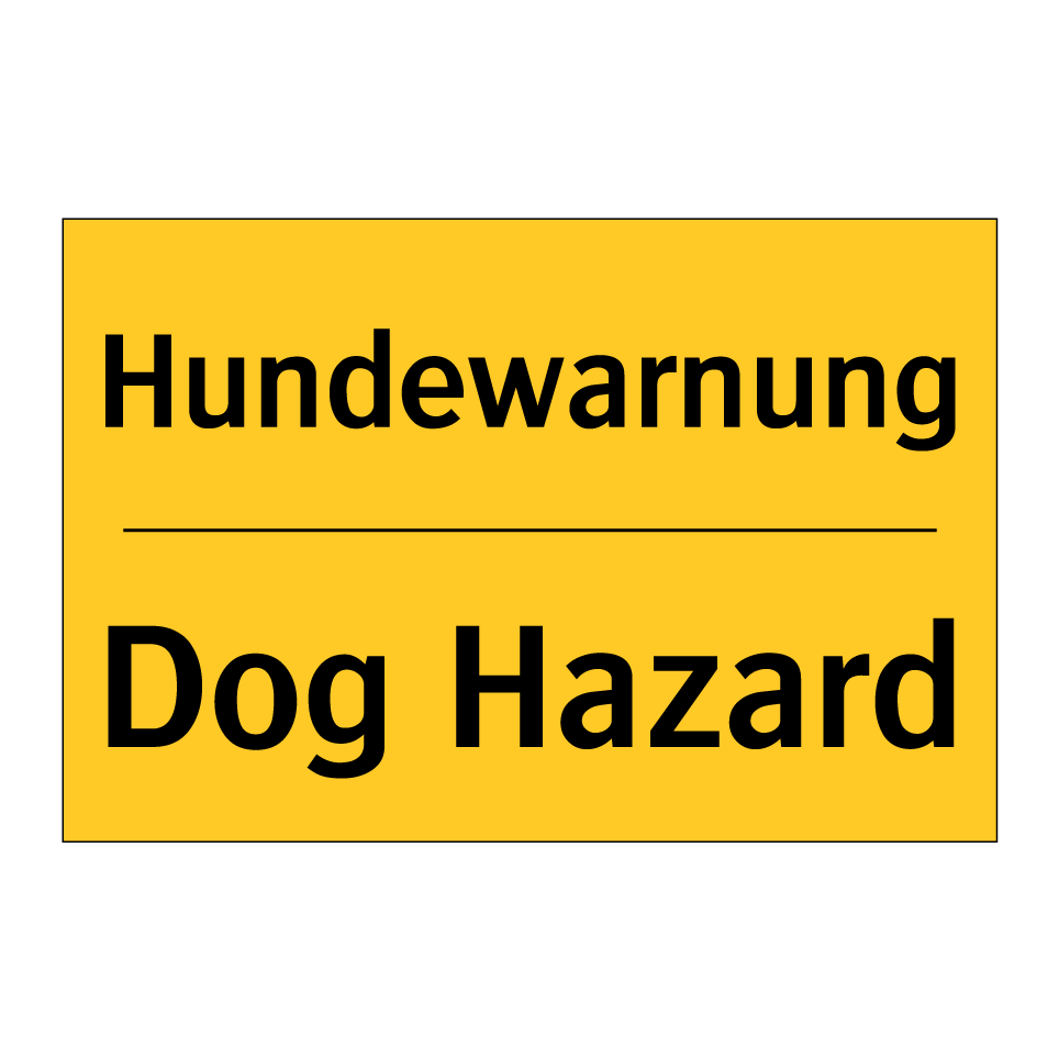 Zweisprachiges Warnschild mit deutschem Text Hundewarnung und englischem Text Dog Hazard