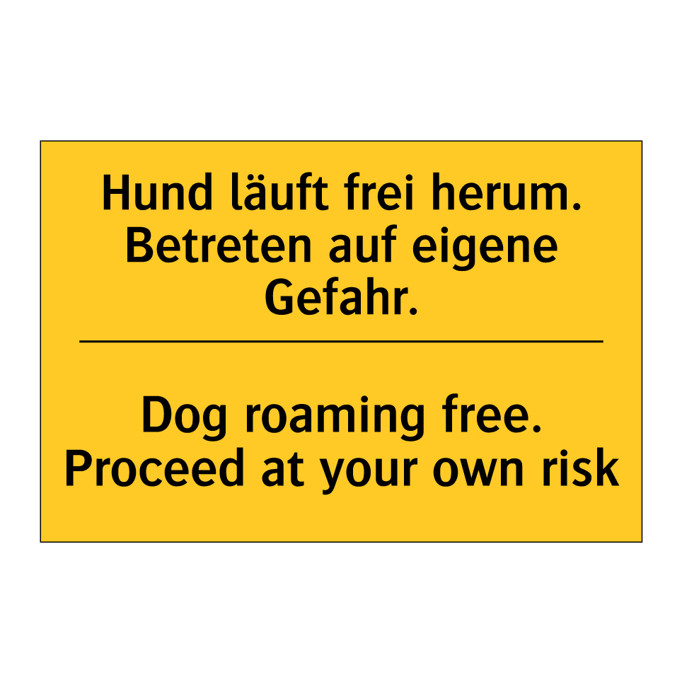 Zweisprachiges Warnschild mit deutschem Text Hund läuft frei herum. Betreten auf eigene Gefahr. und englischem Text Dog roaming free. Proceed at your own risk