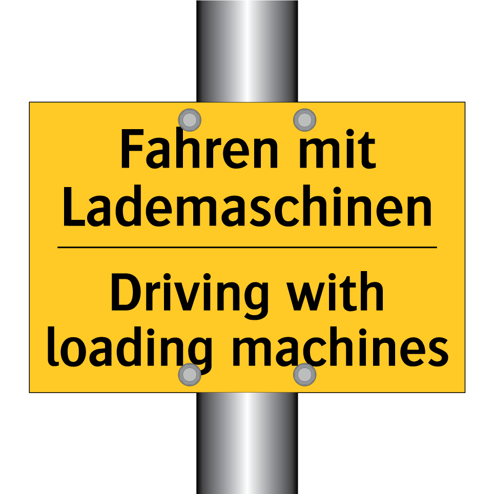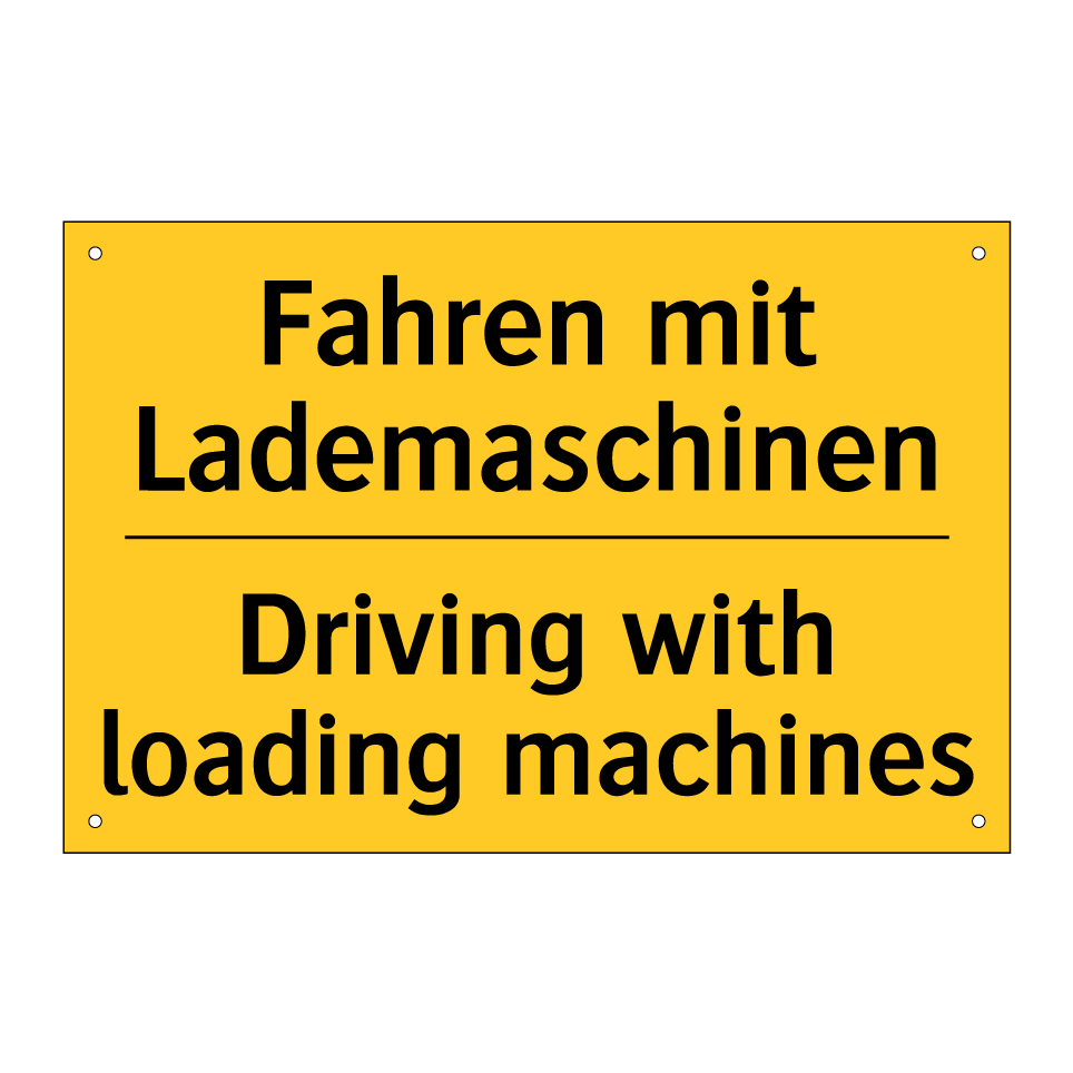 Zweisprachiges Warnschild mit deutschem Text Fahren mit Lademaschinen und englischem Text Driving with loading machines