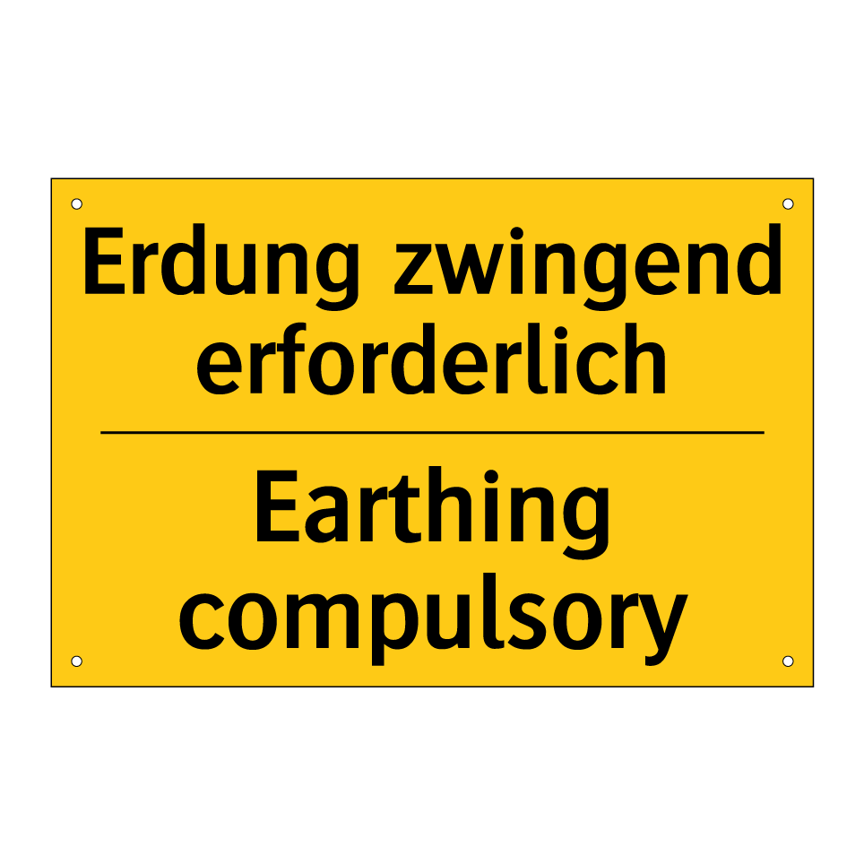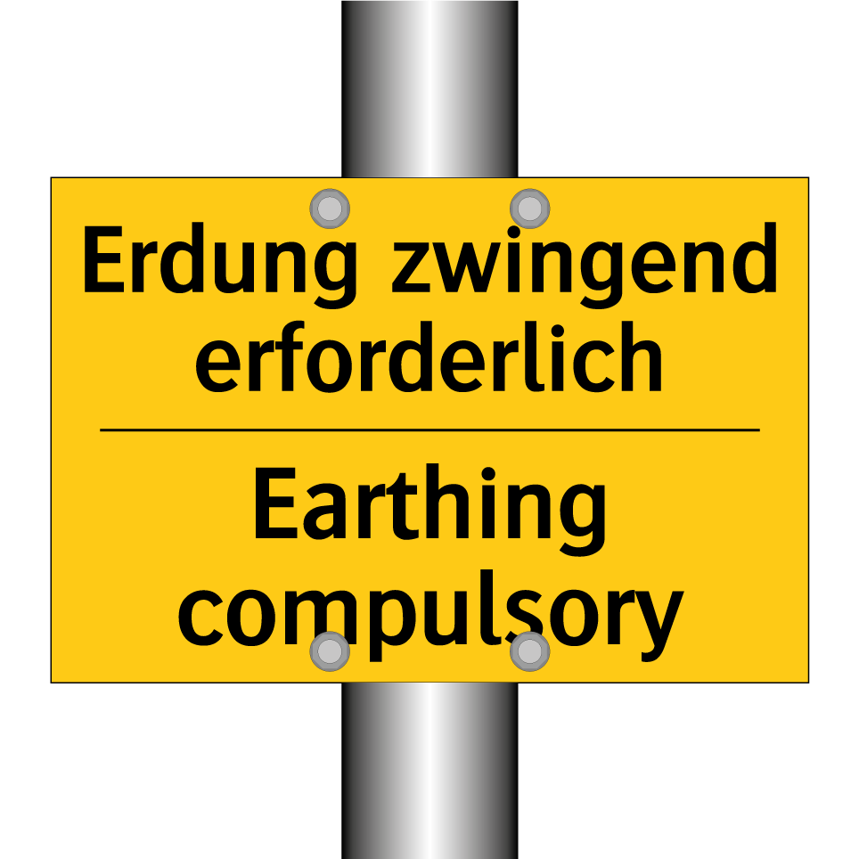 Zweisprachiges Warnschild mit deutschem Text Erdung zwingend erforderlich und englischem Text Earthing compulsory