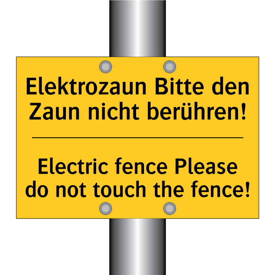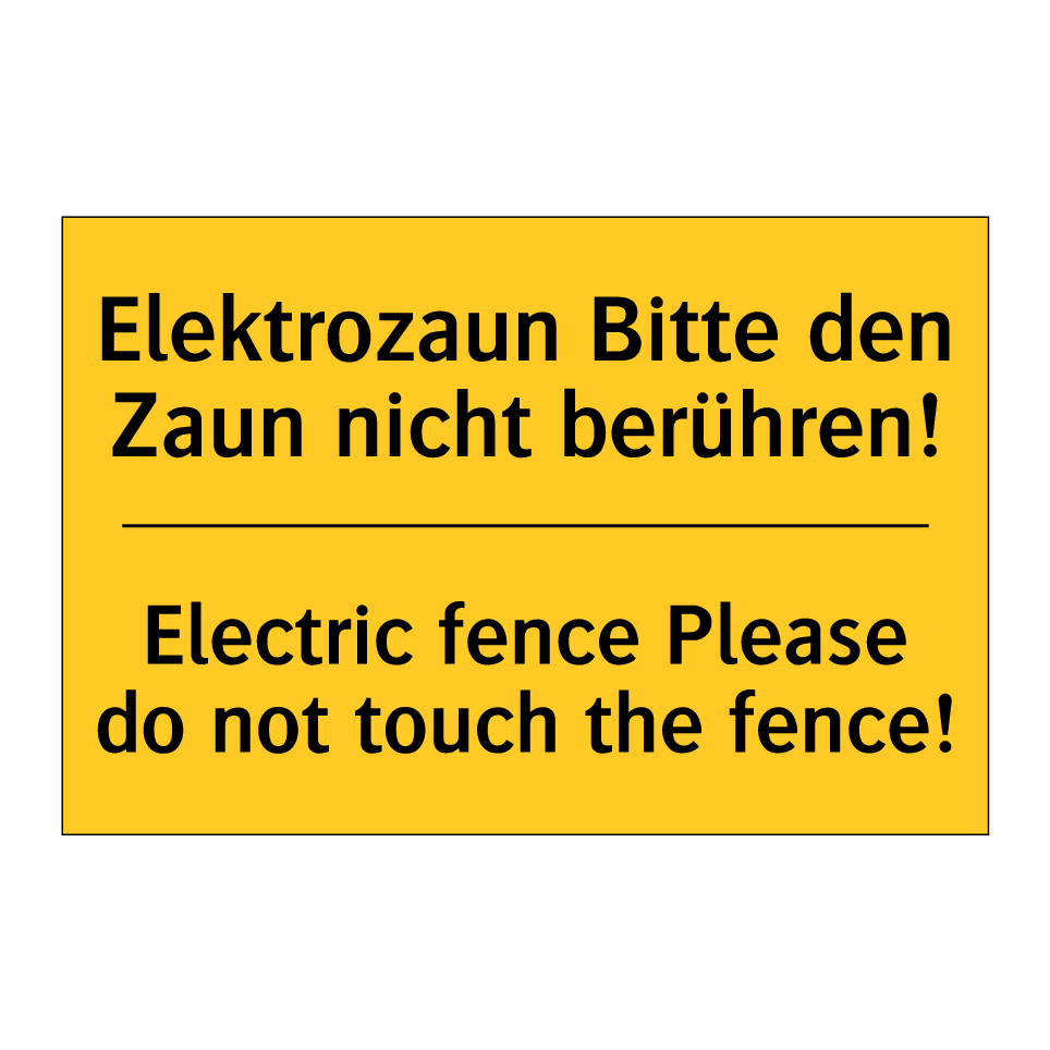 Zweisprachiges Warnschild mit deutschem Text Elektrozaun Bitte den Zaun nicht berühren! und englischem Text Electric fence Please do not touch the fence!