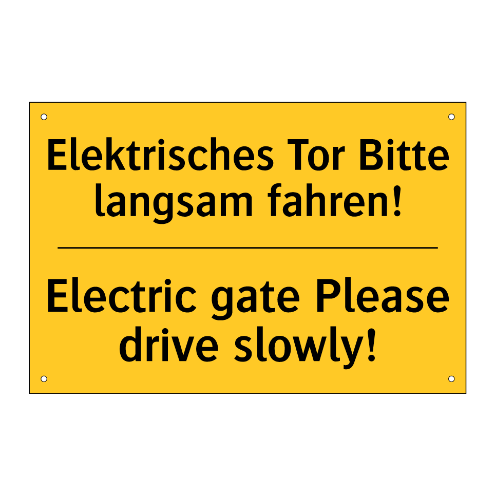 Zweisprachiges Warnschild mit deutschem Text Elektrisches Tor Bitte langsam fahren! und englischem Text Electric gate Please drive slowly!