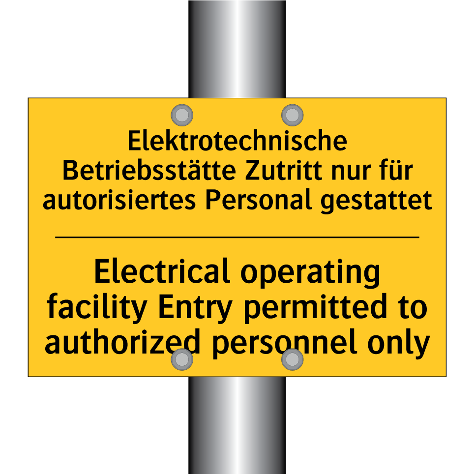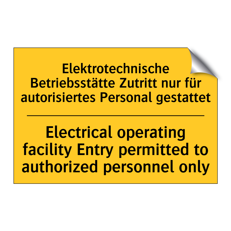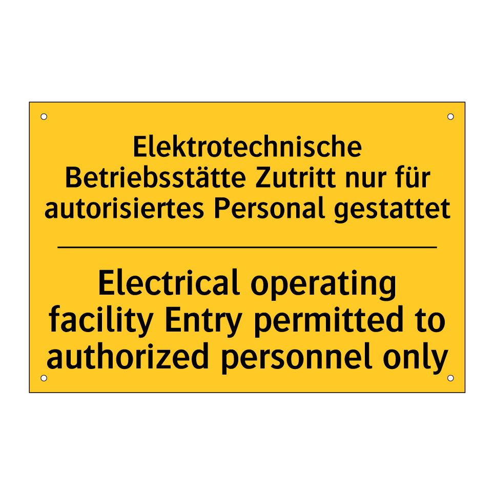 Zweisprachiges Warnschild mit deutschem Text Elektrotechnische Betriebsstätte Zutritt nur für autorisiertes Personal gestattet und englischem Text Electrical operating facility Entry permitted to authorized personnel only
