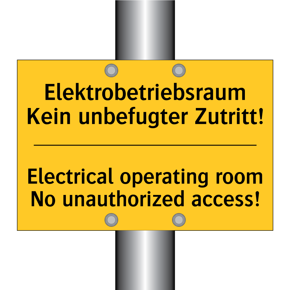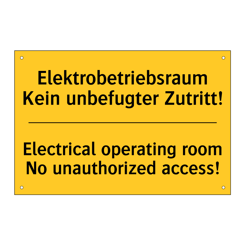 Zweisprachiges Warnschild mit deutschem Text Elektrobetriebsraum Kein unbefugter Zutritt! und englischem Text Electrical operating room No unauthorized access!