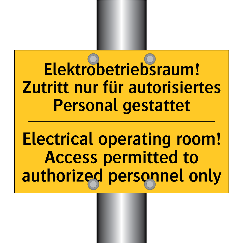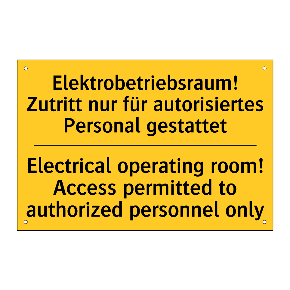 Zweisprachiges Warnschild mit deutschem Text Elektrobetriebsraum! Zutritt nur für autorisiertes Personal gestattet und englischem Text Electrical operating room! Access permitted to authorized personnel only