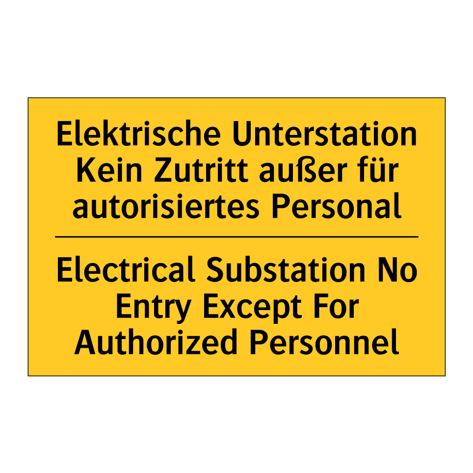 Zweisprachiges Warnschild mit deutschem Text Elektrische Unterstation Kein Zutritt außer für autorisiertes Personal und englischem Text Electrical Substation No Entry Except For Authorized Personnel